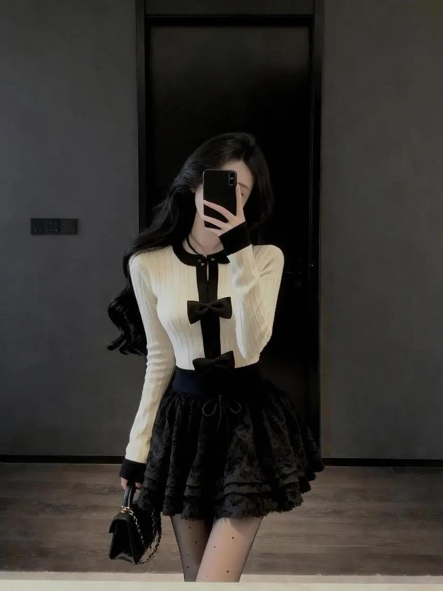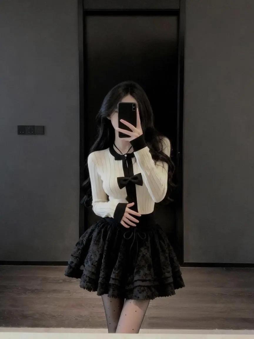 今天是黑白配的甜酷感 针织衫上的蝴蝶结是藏不住的少女心 蓬蓬裙晃出蓬松的快乐 连空气都裹着点甜飒的味道