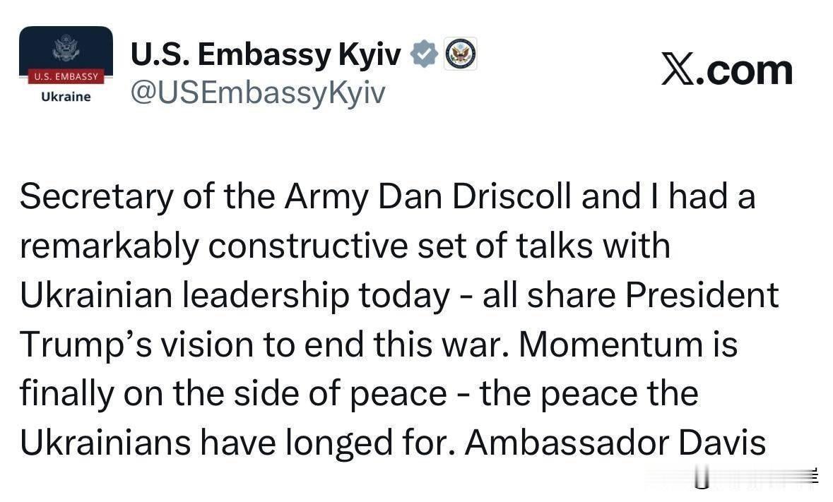 美国驻基辅大使Davis表示他与乌克兰领导人进行了极具建设性的会谈,他们都认可川普总统的远景。 “陆军部长 Dan Driscoll 和我今天与乌克兰领导层进行了一系列极具建设性的会谈——所有人都认同 川普总统结束这场战争的愿景。和平的势头终于站在我们这边——这是乌克兰人民长久以来渴望的和平。”