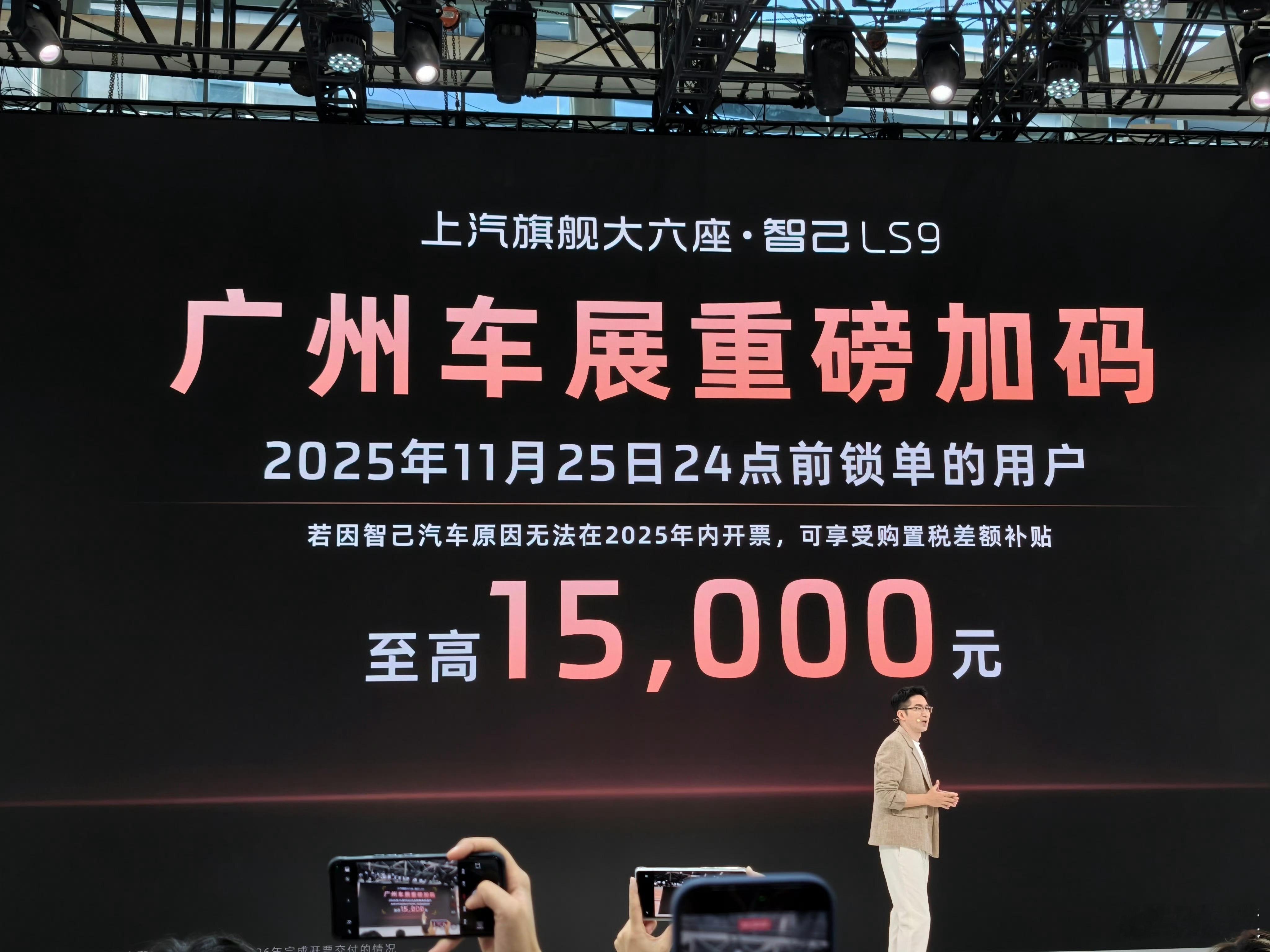 这次智己展台的主角绝对是LS9,上市25分钟订单突破5000台,而且11月25日 24点前锁单的用户,智己给你兜底购置税。