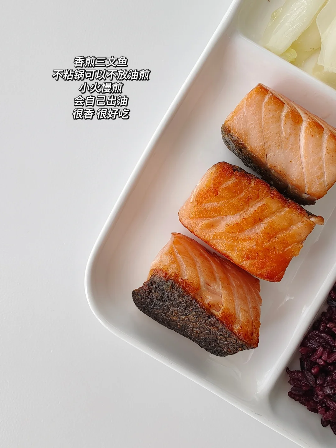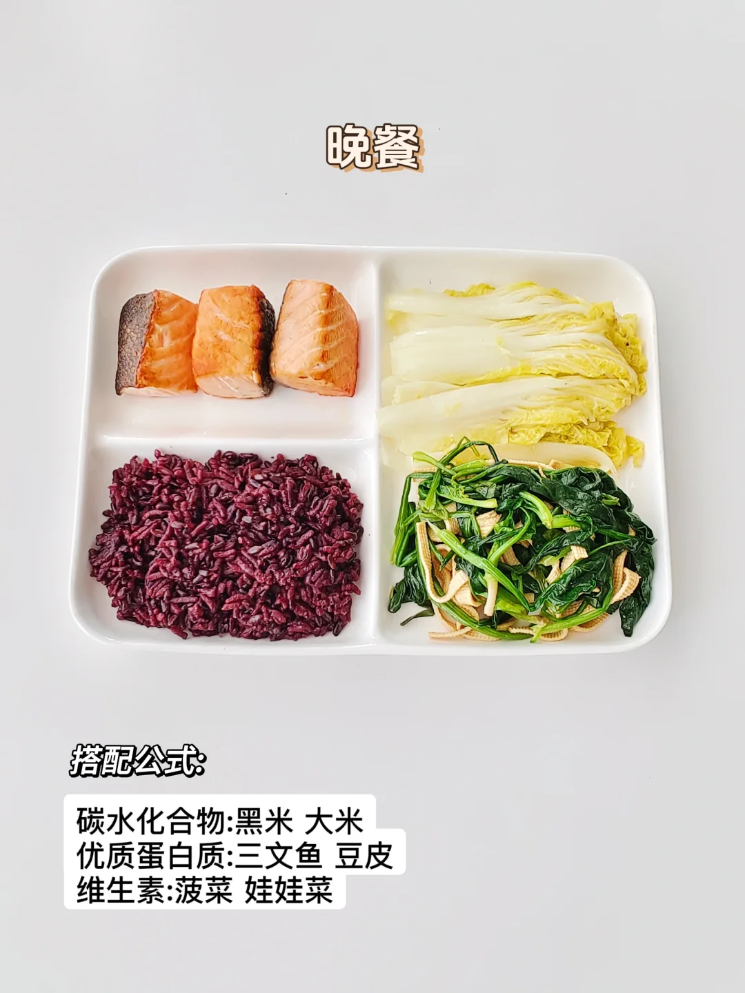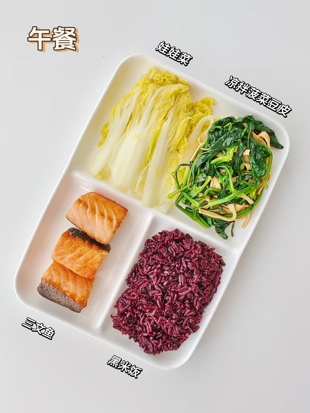黑米米饭➕香煎三文鱼➕凉拌菠菜豆皮➕娃娃菜