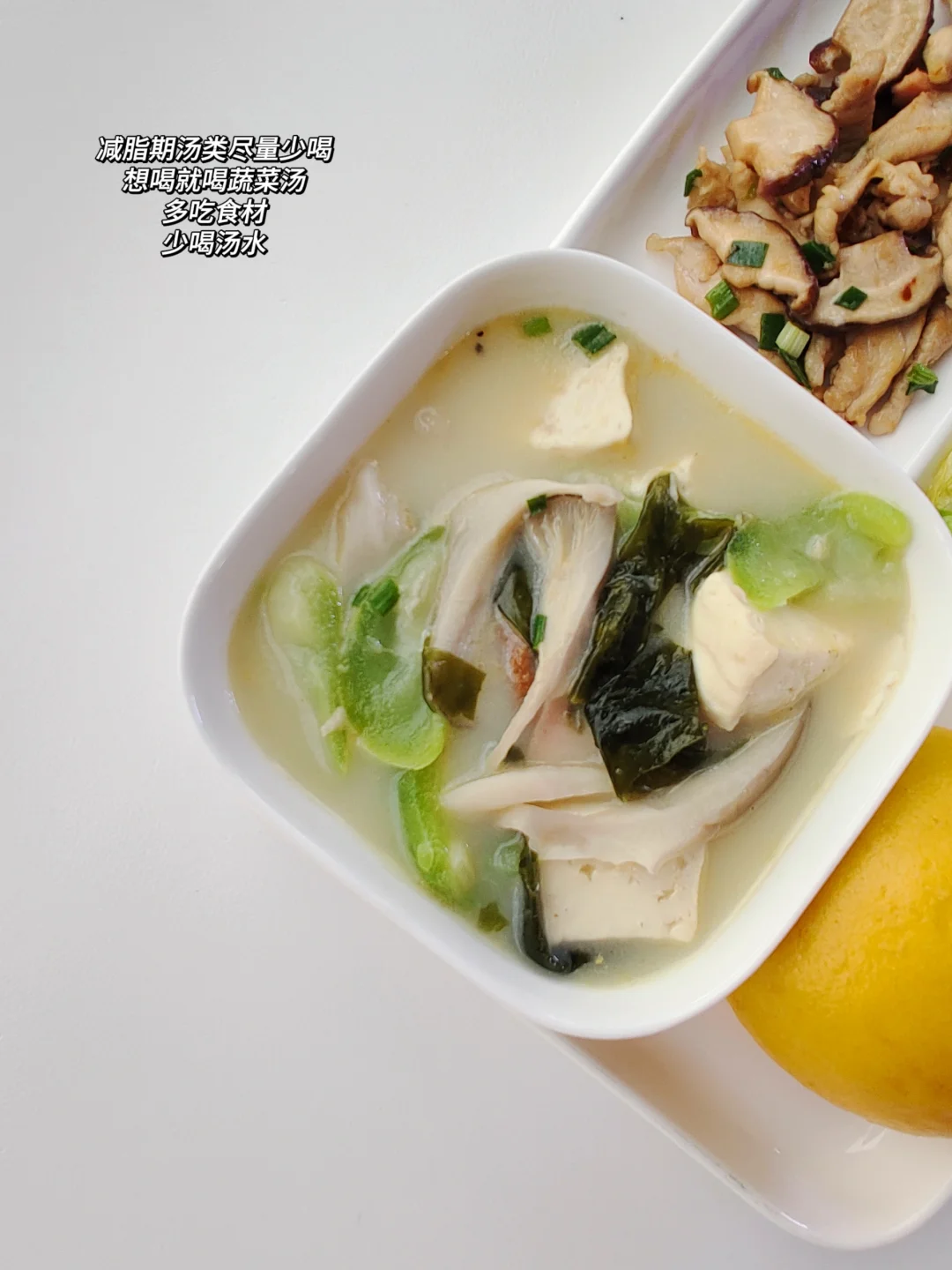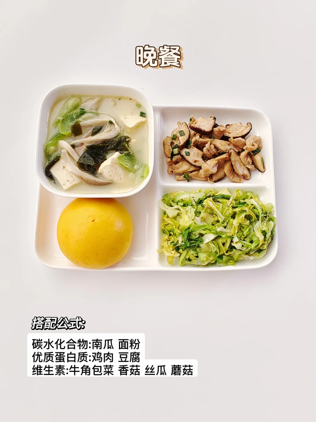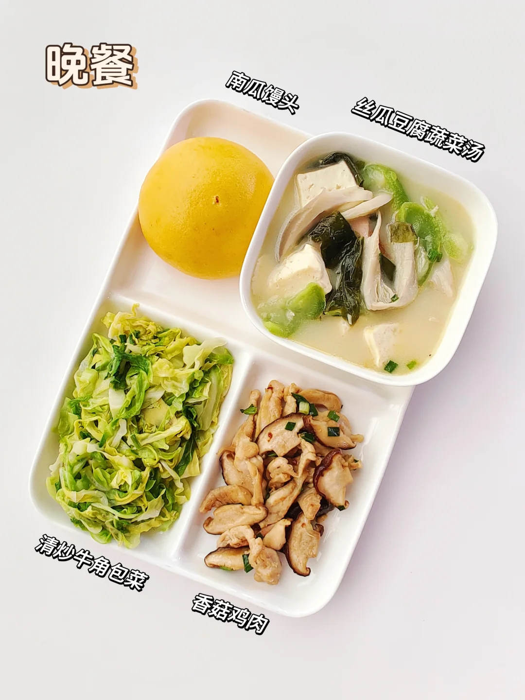 南瓜馒头➕香菇鸡肉➕清炒牛角包菜➕丝瓜豆腐蔬菜汤