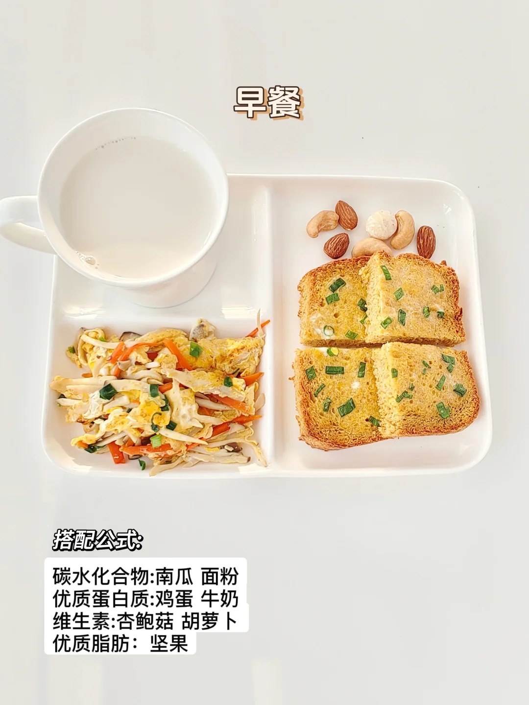 香葱鸡蛋烤吐司➕杏鲍菇炒蛋➕坚果➕牛奶