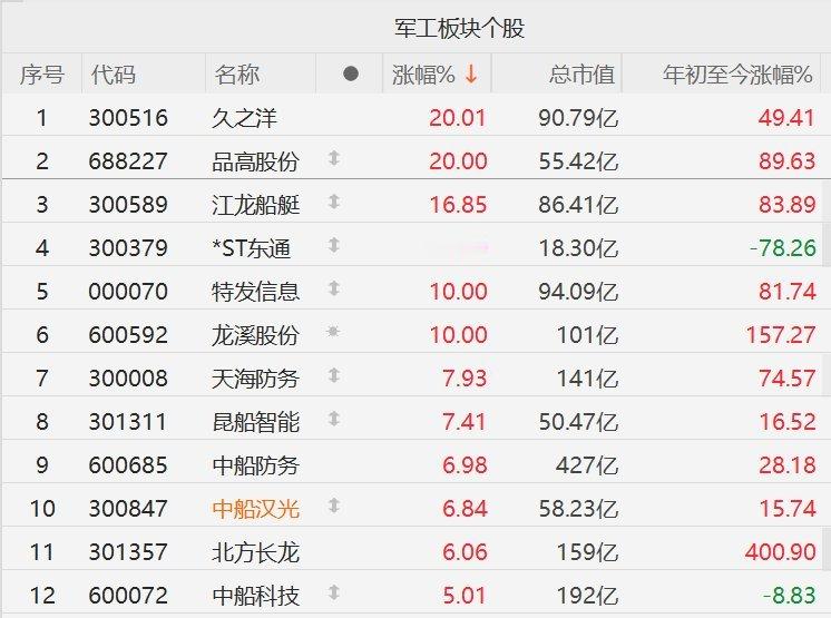 【 ,江龙船艇涨超16%,天海防务涨超7%】 11月21日,A股市场军工股表现强势,其中,久之洋、品高股份20CM涨停,江龙船艇涨超16%,特发信息、龙溪股份10CM涨停,天海防务、昆船智能涨超7%,中船防务、中船汉光、北方长龙涨超6%,中船科技涨超5%。
