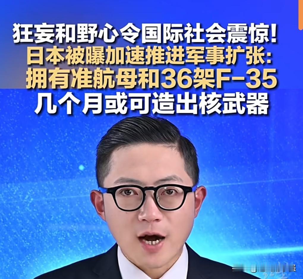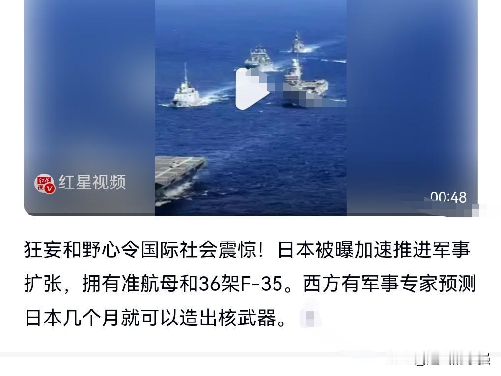 我们要小心日本的狼子野心啊。 毕竟出现了高市早苗这样好战的首相。 11月21日在网上看到这么个事情。 日本被曝加速推进军事扩张,拥有准航母和36架F-35。 更让人担心的是,有西方专家称日本数月内或可造出核武器。 那真是让人不得不防啊。 毕竟日本军国主义不死。