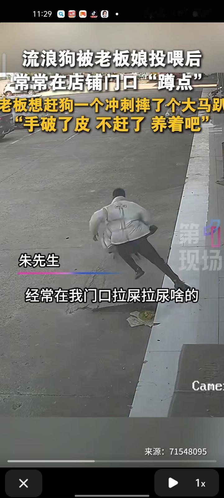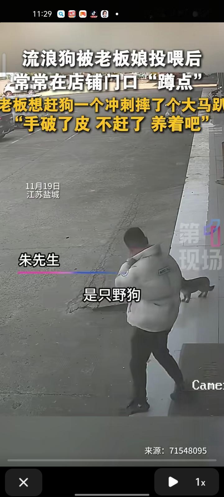 11月19日,盐城市滨海县。流浪狗被老板娘投喂后,常常在店铺门前“蹲点”。老板想赶狗,一个冲刺脚一滑摔了个大马趴,好在只是手受伤,连没受伤,事后老板决定不赶了,养着。