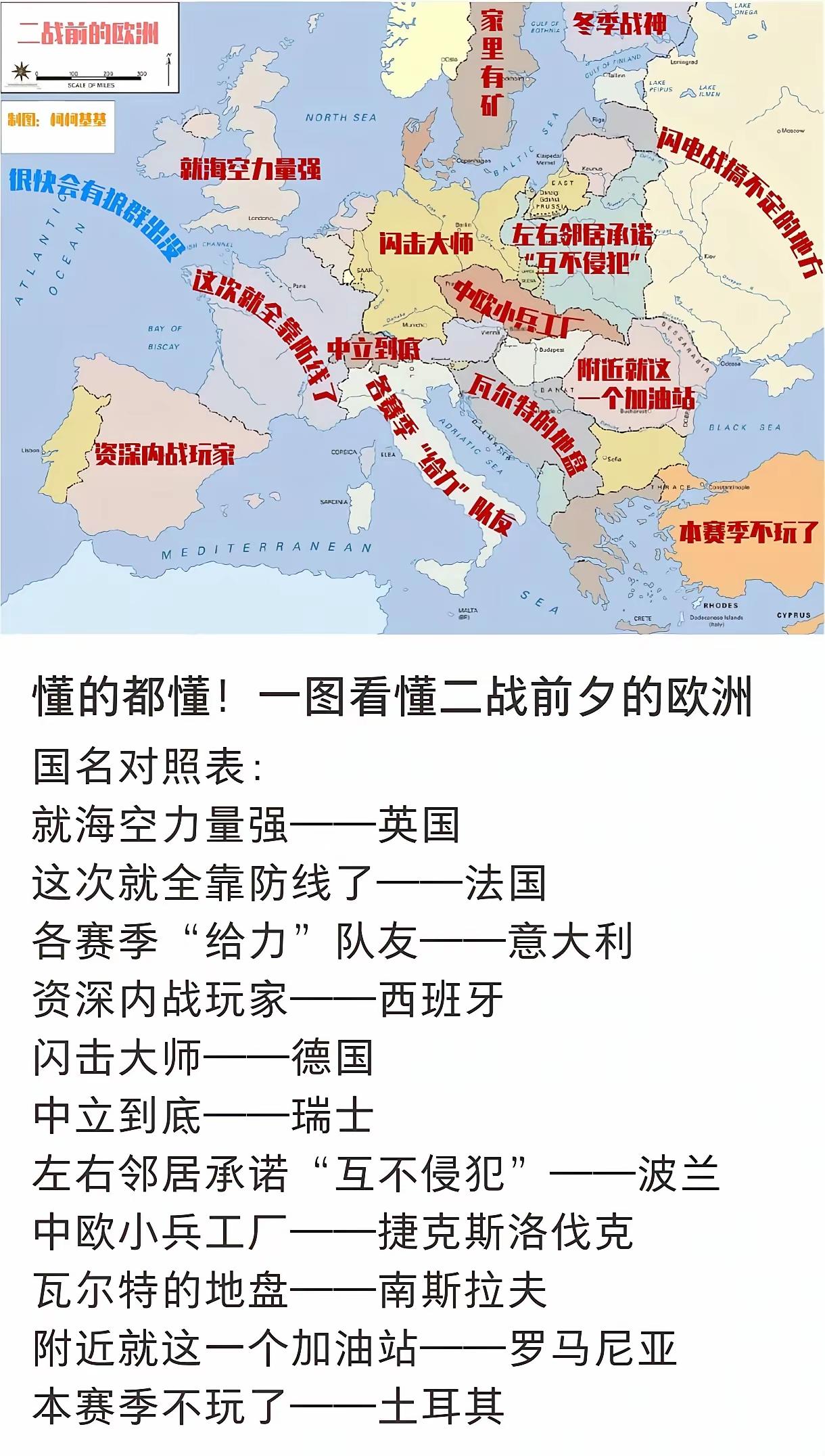 有人这样总结二战开始前的欧洲。当时的各国,心态确实如图所示。结果,谁也跑不掉,一个个都被快速拖入战火。 如今的局势,又何尝不是如此?战争不是你想怎么样就怎么样,你想不让战争爆发就不会爆发?你想波及不到自己就波及不到?你想防御就能防御?你想躺平就能躺平? 矛盾一旦激化,到了舆论战经济战贸易战无法解决的程度,就只能用战争来解决。这就跟人与人闹矛盾一样,讲理实在讲不通,最后就要挥拳头,谁拳头大谁就占便宜,谁身体弱动作慢不敢下狠手,谁就得吃亏。 所以,平时多锻炼身体准没错。就算不想欺负别人,也得随时防备别人来欺负自己。起码,也得保证一旦跟人动起手来,保证自己不吃太多亏。 二战世界格局 二战影响 二战今昔对比 欧洲二战 二战后国际形势 二战地图