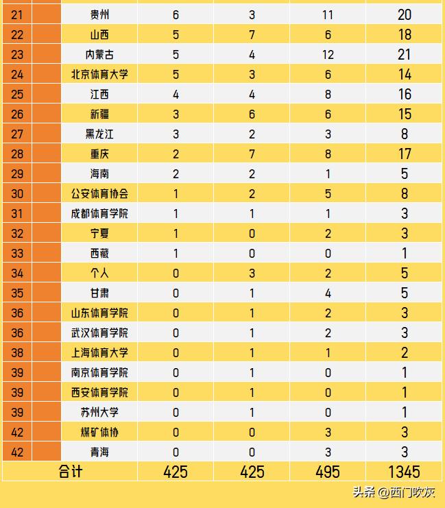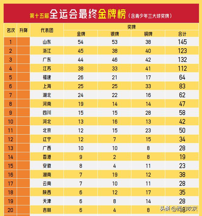 【全运会金牌榜大结局!山东领跑双榜浙粤苏稳居第二集团!】 全运会所有419项比赛已全部完赛,山东队以50金51银38铜领跑金牌榜和奖牌榜。 按照规则,去年青少年三大球比赛成绩计入本届全运会,山东加上四金两银,以54金53银38铜遥遥领先,领跑双榜。