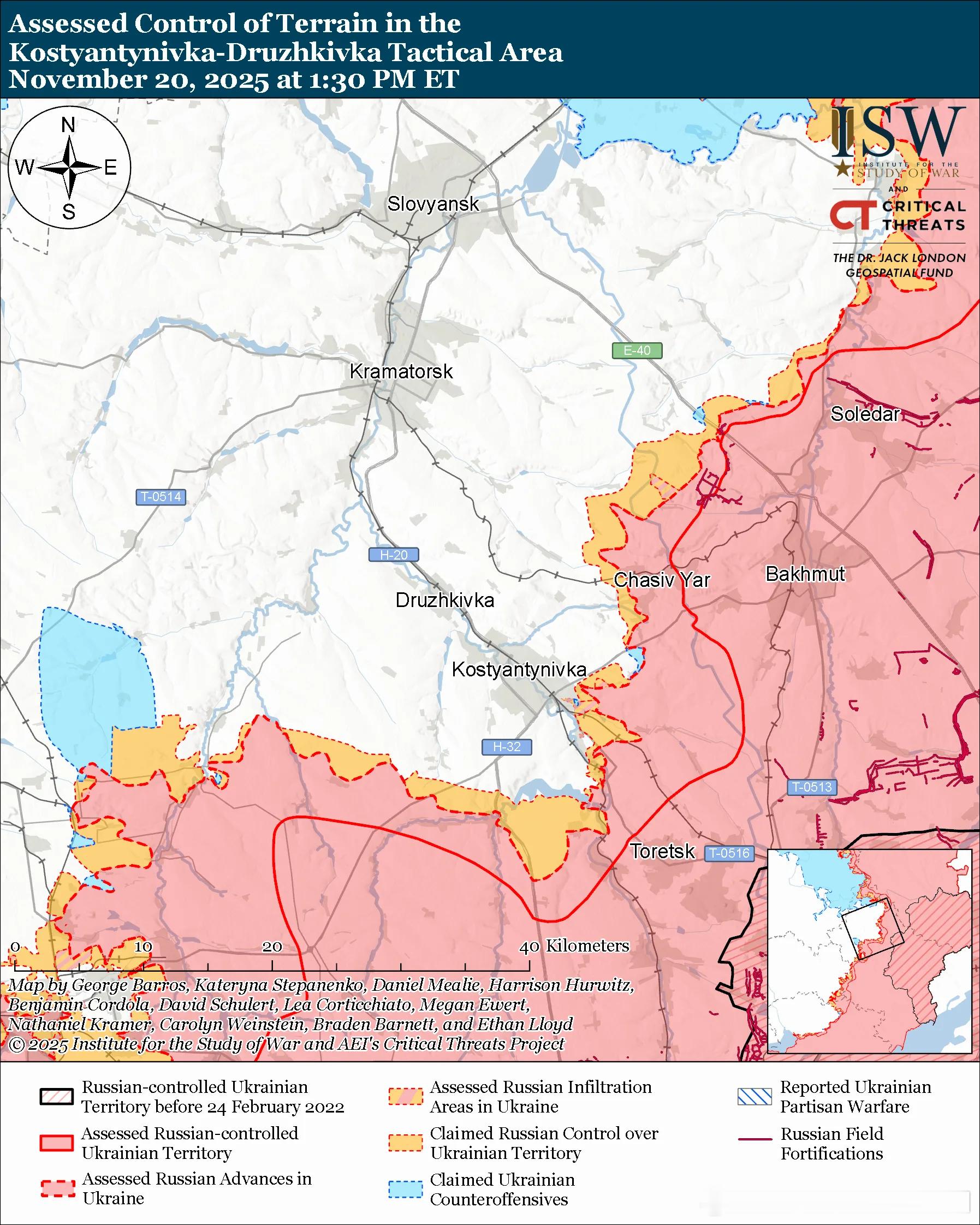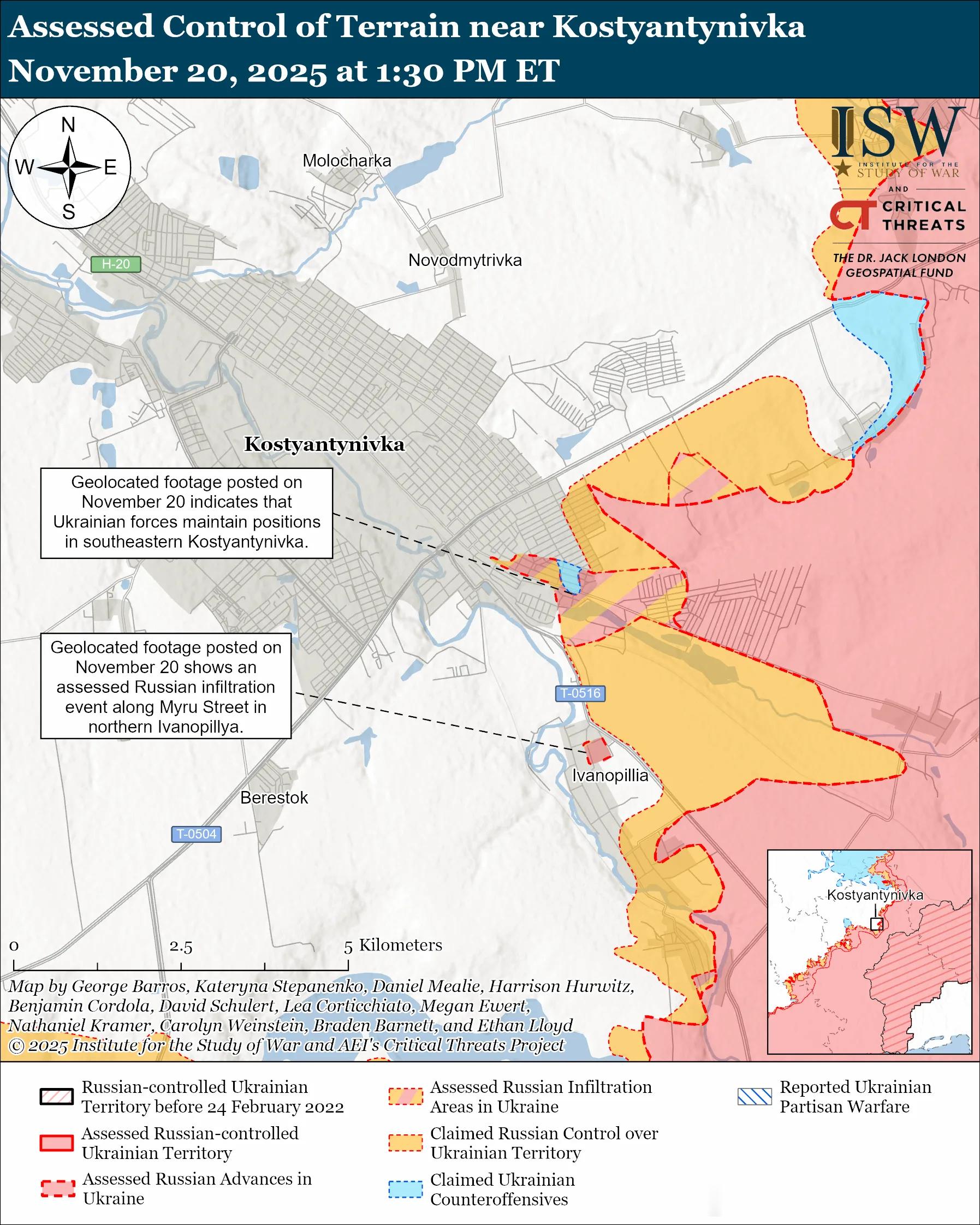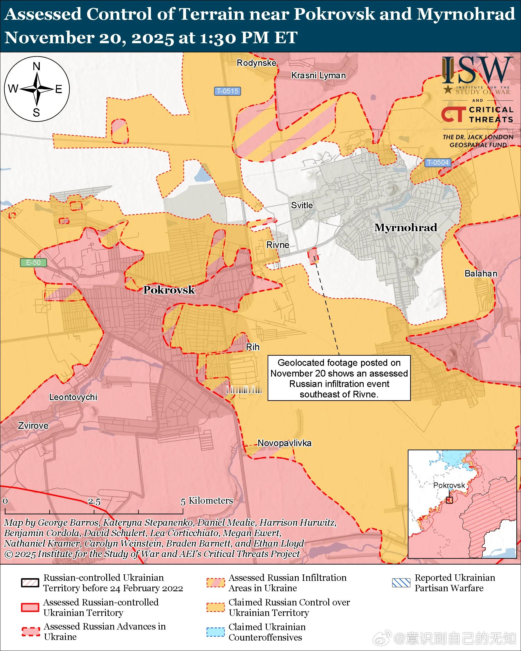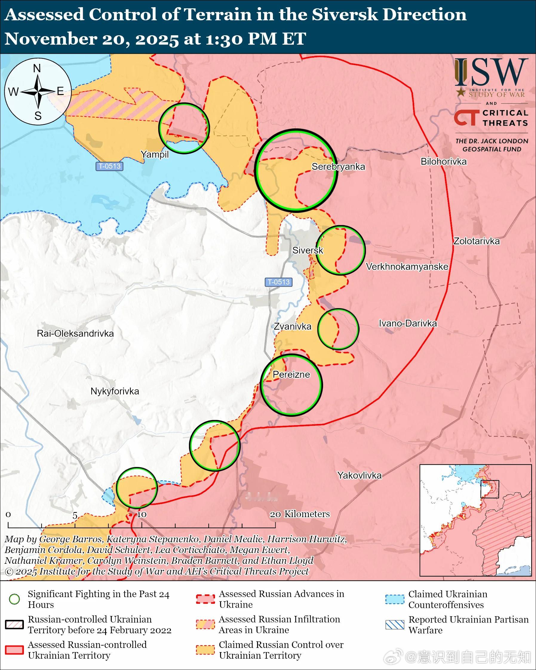 俄军主要行动3俄军目标:占领顿涅茨克州全境,并向第聂伯罗彼得罗夫斯克州推进11月20日俄军继续向锡维尔斯克方向发起进攻,但并未取得确切进展。未经证实的说法:俄罗斯军事博客作者声称,俄军已向锡韦尔斯克中部和东南部推进;推进至普拉托尼夫卡(锡韦尔斯克西北部)以北的锡韦尔斯基顿涅茨河南岸;以及德罗尼夫卡(锡韦尔斯克西北部)、维姆卡和伊万诺-达里夫卡(均位于锡韦尔斯克东南部)附近。一位俄罗斯军事博客作者声称,俄军目前已占领锡韦尔斯克20%至25%的地区。11 月 19 日和 20 日,俄军在锡韦尔斯克附近及城内发动进攻;在锡韦尔斯克西北部,靠近德罗尼夫卡和普拉托尼夫卡,向扎基特涅和迪布罗瓦方向进攻;在锡韦尔斯克东北部,靠近谢列布里扬卡;在锡韦尔斯克东部,靠近韦尔赫诺卡米扬斯克;在锡韦尔斯克东南部,靠近维姆卡和伊万诺-达里夫卡;在锡韦尔斯克南部,靠近佩列伊兹涅、费多里夫卡和兹瓦尼夫卡。乌克兰第11军(AC)发言人德米特罗·扎波罗热茨中校于11月20日报告称,俄军于11月19日对锡韦尔斯克发动了三波摩托车进攻,乌克兰军队击退了这次进攻并摧毁了10辆摩托车。扎波罗热茨指出,俄军正试图巩固锡韦尔斯克北部郊区的阵地,并清除通往该定居点的道路上的地雷,为可能发生的机械化进攻做准备。乌克兰军队最近向科斯特扬季尼夫卡-德鲁日基夫卡战术区推进。评估乌克兰的进展:11 月 18 日发布视频的地理位置信息显示,乌克兰军队在科斯蒂安蒂尼夫卡东南部取得了进展。评估的俄罗斯渗透:11 月 16 日发布、11 月 20 日定位的视频显示,乌克兰军队在伊万诺皮利亚北部(科斯蒂安蒂尼夫卡东南部)袭击了俄军。ISW 评估认为这是一次俄军渗透任务。俄罗斯声称占领的区域范围:11 月 20 日发布的地理定位视频显示,乌克兰军队在科斯蒂安蒂尼夫卡东南部保持阵地或取得进展——此前俄方声称俄军在该地区驻扎。俄军在科斯特扬尼夫卡附近及其内部发动进攻;从Kostyantynivka以北前往Virolyubivka和Bilokuzmynivka;位于 Kostyantynivka 东北部,靠近 Minkivka、Novomarkove 和 Chasiv Yar;科斯蒂安提尼夫卡 (Kostyantynivka) 以东,靠近斯图波奇基 (Stupochky)、普雷德泰基恩 (Predtechyne) 和比拉霍拉 (Bila Hora);科斯蒂安提尼夫卡东南部,靠近谢尔比尼夫卡、普莱什奇夫卡、伊万诺皮利亚、奥列克桑德罗-舒尔坦、克莱班-比克和托列茨克; Kostyantynivka 西南方向,靠近 Yablunivka 和 Stepanivka 方向; Druzhkivka以南,靠近Rusyn Yar;在 Druzhkivka 西南部靠近 Sofiivka、Volodymyrivka 和 Novolenivka 的地方。战斗序列:据报道俄第58独立特种部队营(非正式名称为“猎人”特种部队分遣队)(第51合成集团军[CAA],南部军区[SMD])和第1008摩步团(第6摩步师,第3集团军)的(FPV)无人机操作员正在科斯蒂安蒂尼夫卡袭击乌克兰阵地。第 20 摩步师(第 8 集团军)第 68 独立侦察营的巡飞弹操作员继续在索菲伊夫卡和新巴甫利夫卡(德鲁日基夫卡西南)附近袭击乌克兰的装备、军人和车辆。11月20日俄军继续在多布罗皮利亚战术区开展进攻行动,但并未取得确切进展。未经证实的说法:一位俄罗斯军事博主声称,俄军在沙霍韦(多布罗皮利亚以东)和扎特绍克(多布罗皮利亚东南)附近推进。11月19日和20日,俄军在多布罗皮利亚以东的沙霍韦和新沙霍韦附近以及多布罗皮利亚东南的潘基夫卡和扎波维德内发动进攻。11月20日俄军继续向波克罗夫斯克方向发起进攻,但并未取得确切进展。评估俄罗斯渗透:11 月 20 日发布的地理定位视频显示,俄军在里夫内东南(波克罗夫斯克以东)靠近 T-0504 波克罗夫斯克-科斯佳季尼夫卡公路的地方进行了一次渗透任务。未经证实的说法:一位俄罗斯军事博主声称,俄军向波克罗夫斯克以北、罗丁斯克西南(波克罗夫斯克以北)以及赫里申东南郊区(波克罗夫斯克西北)推进。11月19日和20日,俄军在波克罗夫斯克附近及市内发动进攻;在波克罗夫斯克西北部格里申附近;在波克罗夫斯克北部罗丁斯克附近;在波克罗夫斯克东北部切尔沃尼(克拉斯尼)利曼和新经济城附近;在波克罗夫斯克东部里夫内、巴拉汉和米尔诺赫拉德附近;在波克罗夫斯克东南部利西夫卡附近;以及在波克罗夫斯克西南部科特利涅、乌达奇涅和莫洛杰茨克附近发动进攻。俄方声称乌克兰军队在格里申附近进行了反击。乌克兰海军于 11 月 20 日报告称,俄军对米尔诺格勒进行了 KAB-3000 炸弹袭击。作战序列:据报道俄罗斯维加特种部队分遣队(隶属于俄罗斯总参谋部情报总局[GRU]第24近卫特种部队旅)、第35摩步旅(隶属于中央军区[CMD]第41集团军)和第1斯拉维扬斯克摩步旅(隶属于中央军区[SMD]第51集团军)的无人机操作员和炮兵正在波克罗夫斯克方向作战。第56独立特种部队营和第5摩步旅(均隶属于第51集团军)的FPV无人机操作员和其他部队正在米尔诺赫拉德附近作战。11月20日俄军继续向新巴甫洛夫卡方向发起进攻,但并未取得确切进展。未经证实的说法:一位俄罗斯军事博主声称,俄军沿着 T-04-28 新巴甫洛夫卡-达奇涅公路向新巴甫洛夫卡北部和该定居点南部推进。俄军攻击了新帕夫利夫卡附近;位于 Novopavlivka 东北部,靠近 Novoserhiivka 和 Novomykolaivka; Novopavlivka 以南,靠近 Filiya 和 Dachne;在新帕夫利夫卡 (Novopavlivka) 西南部靠近 Zelenyi Hai 的地方。11月20日俄军继续在韦利科米哈伊利夫卡方向发动进攻,但并未取得进展。俄军攻击了亚历山德罗赫拉德附