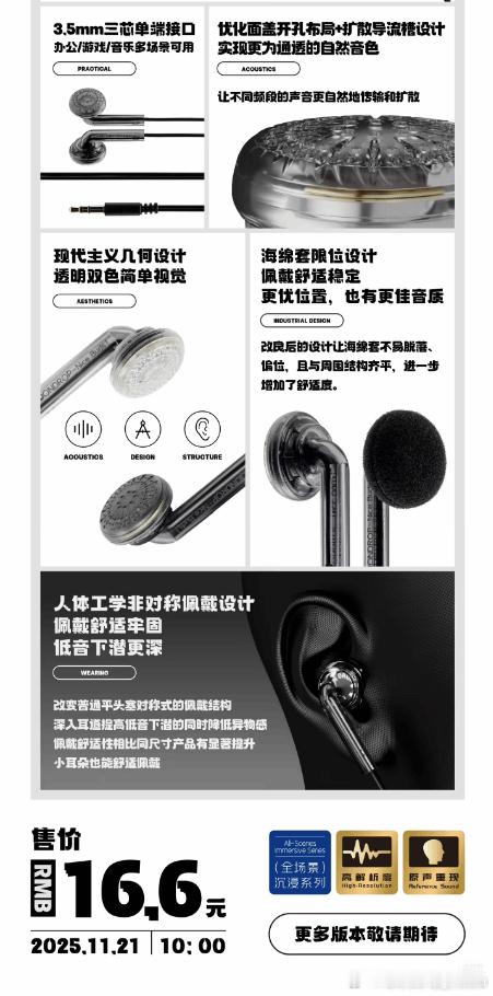 水月雨官宣新款平头耳机 人体工学非对称水月雨官宣Nice Buds平头耳机采用人体工程学非对称式设计,搭载半透明配色外壳,售价16.6元,在11月21日上市。据介绍,这款耳机采用“旗舰同源技术”,搭载15.4mm钕磁特调大动圈单元,机身采用低音增强气流管道设计、双重后腔阻尼声学并联,号称“针对平头塞佩戴优化”,实现“澎湃下潜与干净中频”。设计方面,这款耳机的外壳采用优化面盖开孔布局 + 扩散导流槽设计,可实现更加通透的音色,配备现代主义集合设计外观,可选透明黑、透明白两种颜色,带有改良的海绵套限位设计,可让耳机佩戴更加稳定,与周围结构齐平,增强舒适度。此外,这款耳机搭载3.5mm三芯单端接口,兼容各种带有耳机孔的设备。