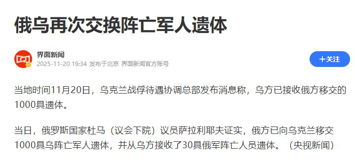 俄乌再次交换阵亡军人遗体 当地时间11月20日,乌克兰战俘待遇协调总部发布消息称,乌方已接收俄方移交的1000具遗体。 差不多同一时间,俄罗斯议会的议员萨拉利耶夫也证实了这事,还补充了个关键情况,俄罗斯这边也从乌克兰接回了30具俄军阵亡人员的遗体。 当战场的炮火还在局部轰鸣,一条关于“回家”的消息却穿透了硝烟。当地时间11月20日,乌克兰战俘待遇协调总部的一则通报让外界聚焦,乌方已收到俄方移交的1000具本国阵亡军人遗体,而几乎同一时间,俄罗斯国家杜马议员萨拉利耶夫也证实了这一交换,更补充了关键细节,俄方同时从乌方接回了30具俄军阵亡人员的遗体。 这可不是俄乌第一次在冲突里,专门为阵亡将士的遗体交接开绿灯。早在2025年6月,双方就一次性换过,乌克兰接回1212具己方遗体,俄罗斯接回27具。当时俄总统助理梅金斯基就说过,这么做是按之前在土耳其伊斯坦布尔谈好的规矩来的。 这次1000换30的数字差,也不是头一回出现。看以前的记录就知道,换多少遗体,主要看最近战场形势怎么样,还有双方控制的区域里,能统计到多少阵亡人员,不是说谁妥协了。 别看着只是遗体交接,背后得好多方一起细致配合才行。跟之前的交换一样,这次乌克兰这边,国家安全局、军队、内政部好几个部门一起动手接收,红十字会也全程帮忙,负责把遗体安全运过来,先初步确认身份。 对乌克兰来说,遗体接回来只是第一步,接下来法医团队马上就会跟进,用DNA比对这些办法,把每一位阵亡士兵的身份都核实清楚,再通知他们的家人。要知道,在战火里盼消息的家庭,哪怕只是能好好送孩子最后一程,都是最大的安慰。 俄罗斯那边,也把让阵亡军人“魂归故土”当大事。萨拉利耶夫证实消息的时候特意说,移交遗体既是尊重死者,也是给两边士兵的家人一个交代。这个态度和俄罗斯之前的立场是一致的,就算冲突还在继续,俄外交部也不止一次说过,会严格按伊斯坦布尔的共识来,慢慢把该交的乌克兰阵亡人员遗体送过去,同时也会尽全力把自己这边将士的遗骨接回来。 值得说道的是,这种关乎人的善意互动,其实在某种程度上,给俄乌双方留了个沟通的口子。2025年到现在,两国在换遗体、换战俘这事儿上,配合越来越有默契。从先换重伤的战俘,到优先换25岁以下的年轻士兵;从一次换几十人,到现在一次换上千人,每回交接背后都得谈、得协调。就像俄总统发言人佩斯科夫说的,就算还在打仗,俄罗斯也没放弃过坐下来谈的可能,而换遗体这事儿,就是这些沟通里最暖的一部分。 有人可能会问,仗还没打完,为啥要在遗体这事儿上费这么大劲?答案其实就藏在那些等消息的家庭里,藏在每个国家对军人的敬重里。对乌克兰的母亲来说,哪怕只能再摸摸孩子冰凉的脸,也是最后的告别;对俄罗斯的父亲而言,把为国捐躯的儿子接回家,是当爹最后的责任。这些遗体早超越了战场的对立,成了两边都不会轻易碰的“情感底线”。 到现在,俄乌都没说下次啥时候再换遗体,但看伊斯坦布尔共识一直都在执行,这种透着人道主义的事肯定还会继续。战场分输赢,但生命值得被尊重。当这上千具遗体跨过战线踏上归途,这份在炮火里守住的温暖,说不定就是将来和平最金贵的引子。