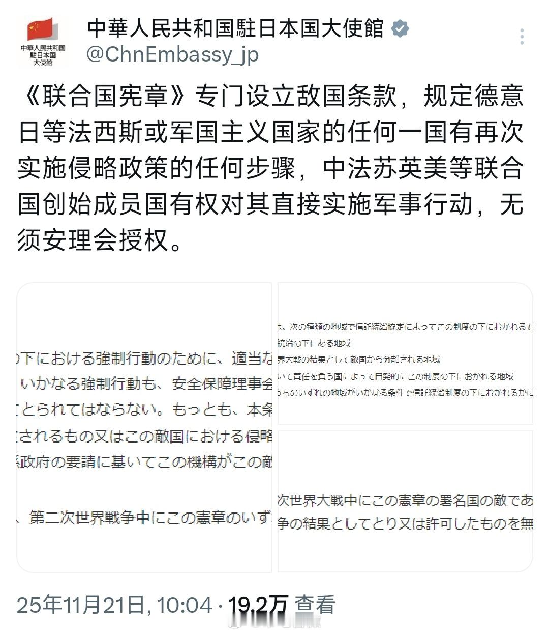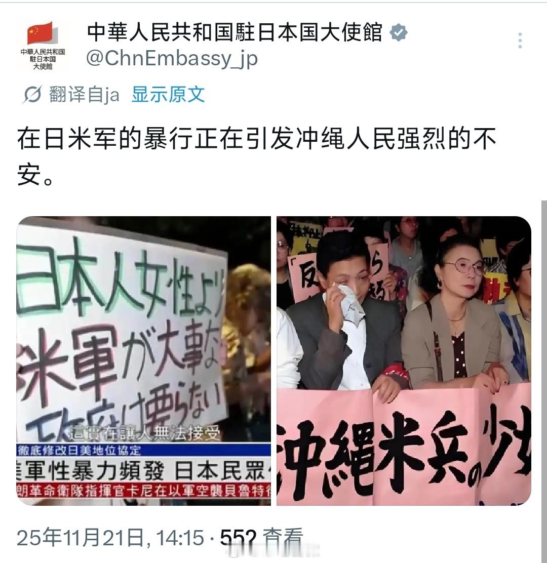 今天我驻日大使馆又给日本网民科普联合国宪章专门设立的敌国条款,后面又发了条驻日美军在琉球的暴行,又把那些日本右翼搞应激了