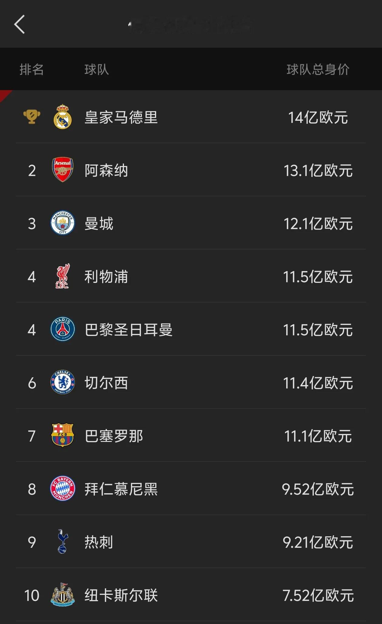 德转最新俱乐部身价榜排名:皇马14亿欧元登顶 德国转会市场最新俱乐部身价排行榜出炉,皇家马德里以14亿欧元总身价位列世界第一。阿森纳(13.1亿欧)、曼城(12.1亿欧)紧随其后,利物浦、巴萨等7支球队身价突破10亿欧元。皇马的高身价得益于姆巴佩、贝林厄姆等前场巨星的估值支撑,英超共有6队跻身前十,展现联赛财政优势。