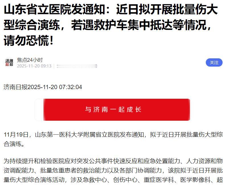 火药味已经越来越浓了,现在不光是黄海和东海进行军事演习,就连山东省都开始进行野战急救演练。   11月19号,山东省第一医科大学附属省医院通告进行大型批量伤综合演练,虽然没明说练给谁看,但这种全员动真格的应急检验,可不是平日里走流程的消防演习。   想想看,批量伤处置最考验的就是战时医疗的保障能力,从伤员分类、紧急手术到后送转运,每个环节几乎都得掐着秒表来,这显然不是应付普通突发公共事件的架势。   而高市早苗这阵子挑起的中日骂战,让中日关系越来越紧张,虽说官方没直接把演练和这事挂钩,但明眼人都清楚这时沿海省份的每一步动作都带着弦。   而山东这地方的战略分量并不小,二战后美国费劲心思要把青岛打造成海军基地,2.7万海军陆战队第六师浩浩荡荡登陆,还通过《中美友好通商航海条约》把军舰开进中国领海,说白了就是看中它连接黄海与渤海的枢纽位置。   当年美国在青岛驻军时,第七舰队司令柯克带着136艘军舰赖在港口不走,现在咱们自己的家门口,总不能等事到临头才慌手慌脚。   俄乌冲突里俄军的教训就摆在眼前,冲突刚开始的时候没重视前线医疗保障,导致伤员救治率上不去直接影响了部队战斗力,后来赶紧把模块化医疗单元往前线挪,才慢慢稳住局面。   而咱们的解放军这些年也在搞医疗保障体系升级,山东作为东部战区的重要支点,搞这种贴近实战的演练再正常不过。   而这次省医院的演练规模自然是小不了,全院动员意味着至少得抽调数百名医护人员,模拟伤员数量怕是得上百,从止血包扎到重症监护的设备都得拉出来遛遛。   批量伤处置和平时救几个病人完全是两码事,得有专门的分诊系统,还得考虑和军方的后送通道衔接,这些细节要是没提前练过,真出事了就是手忙脚乱。   有些人可能觉得这是小题大做,但看看国际上的惯例,哪个军事强国在局势紧张时不搞类似的预备?美军在亚太搞军演时,随军医院船都会跟着跑,咱们不过是把医疗演练放在了陆地上。   高市早苗那边一煽风点火,我们这边就加紧练急救,这种反应速度其实是好事,总比麻痹大意强。当年国民党军队在青岛守不住,很大原因就是后勤保障跟不上,现在咱们的医疗体系既要能应对新冠这样的公共卫生事件,也得有应对冲突的底气。   而且,就算这次演练不是为了可能的冲突做准备,至少也是一次全面的能力体检,反正多练总比少练强,真到用的时候就知道好处了。