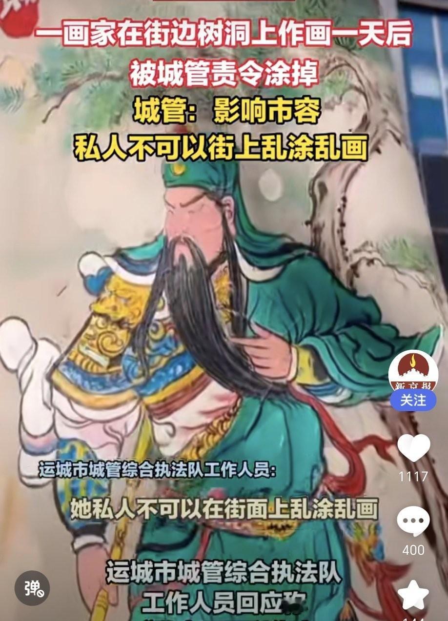 11月19日,山西运城一画家在街边树洞画了五六幅画,结果一天后就被城管责令涂掉。画家说灵感源于大同,给树洞作画能填补树木缺陷,用的是环保防水材料,还避开树皮活体组织。可城管称“私人不可以在街上乱涂乱画,影响市容”。 有网友留言:这次城管管的对,自然的城市绿化,和谐环境等,已经是美的。城市需要统一规划,尽管你是出于好心没有恶意。但是,如果大家都不报备去图图画画,然后就说是艺术创造美,那不就乱了嘛? 这规定没错,赞成!没有规矩不成方圆,公共场合有公共的秩序,想画就得走审批的程序。不然你画他也画,都觉得自己画的好看,那城市大街小巷的随地涂鸦就没法控制了。而且好好的树给涂了,氛围很突兀。个人行为,要遵从整体市容。大家觉得呢?