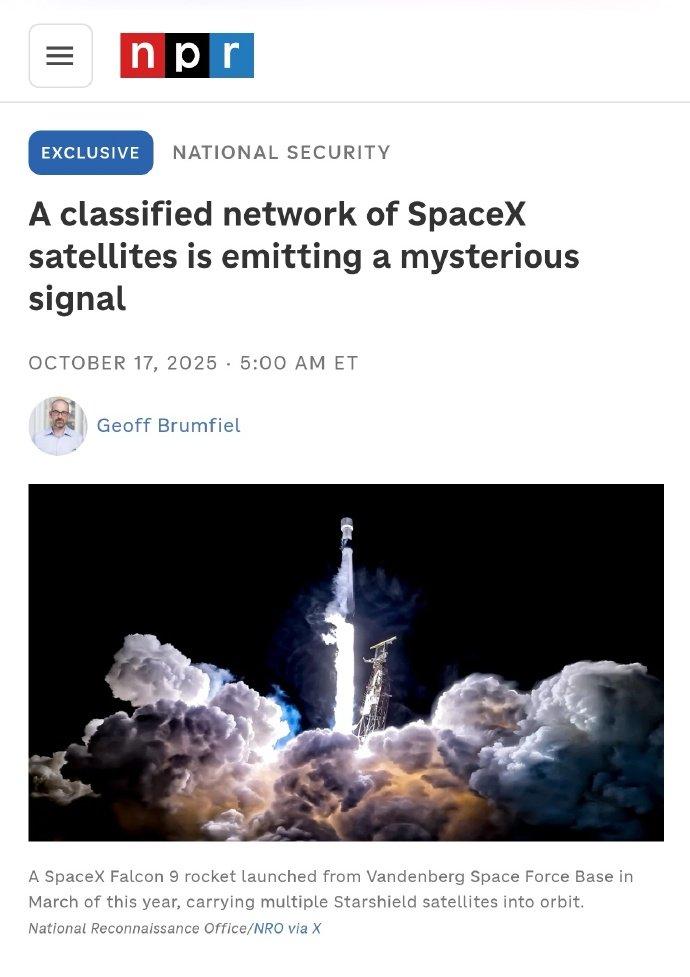 美国国家公共广播电台(NPR)独家报道,SpaceX为美国政府建造的机密军用卫星网络Starshield正发射一种神秘信号,该信号可能违反国际标准。 Starshield卫星使用2025-2110MHz频段“下行传输”数据,而此频段按ITU标准本应用于从地球向卫星“上行传输”指令,加拿大业余卫星追踪者斯科特·蒂利(Scott Tilley)最先发现这一异常,他在2024年5月一次偶然操作中误扫该频段时捕捉到信号,经比对全球业余追踪者共享的卫星位置数据库,确认信号来自Starshield卫星,目前他已检测到170颗Starshield卫星在该频段发射信号,且信号精确频率会不断变化。 Starshield由美国国家侦察局(NRO)运营,截至报道时NRO已进行11次发射,将超过200颗Starshield卫星送入轨道,美国政府为此支付超过了18亿美元,该系统旨在提供军事地球观测和通信服务,宣称能提升数据获取时效性、丰富通信路径并增强抗干扰能力,实现数据分钟级甚至秒级传输。 对于信号用途,蒂利认为可能是为隐藏Starshield卫星运作,频繁变频可防止外界追踪,科罗拉多大学博尔德分校计算机科学教授凯文·吉福德(Kevin Gifford)则提出另一种可能,即SpaceX利用了该上行频段平时信号稀少、较为安静的特点,选择“先使用再请求谅解”……两人均指出该信号存在干扰其他科学和商业卫星的潜在风险,可能导致邻近卫星无法正常响应地面指令,但吉福德认为目前尚未造成重大干扰,否则其他卫星运营商会提出投诉。 SpaceX和NRO均未回应NPR的置评请求,蒂利选择公开这一发现,是希望全球卫星运营商知晓此事,关注这些机密军用卫星可能对空间合法利用造成的干扰。 Starshield用2GHz频段应该是探测吧……军用卫星确实……没啥约束,想怎么用就怎么用[雾霾][雾霾][雾霾]