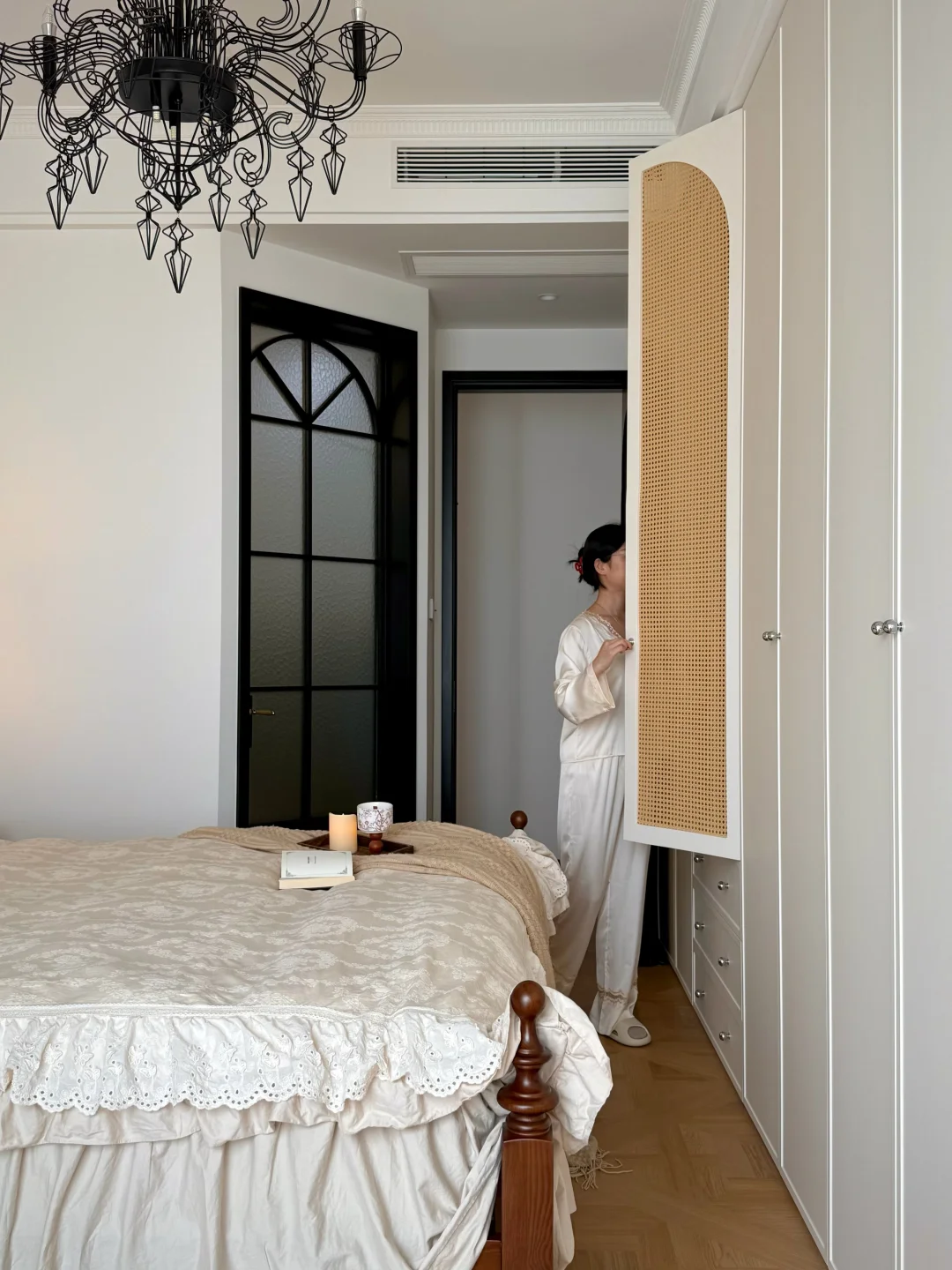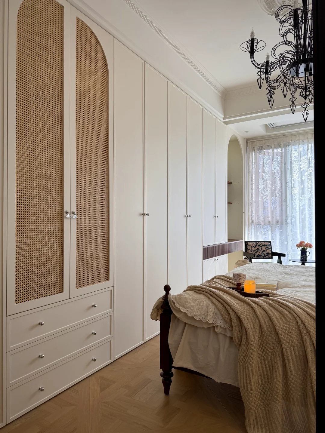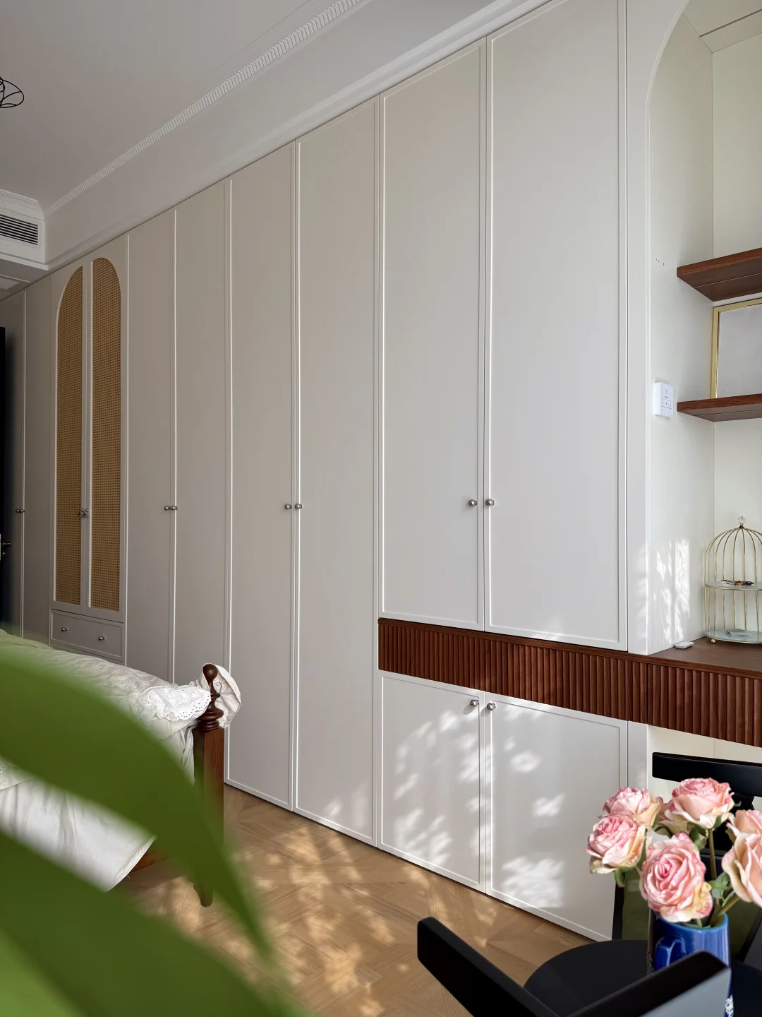 哈喽~欢迎来到我的主卧 卧室开间3.3m(大概16平) 卫生间长2.4宽1.5(大概3.6平) 做了一整排6米床尾衣柜 奶白色门板加上2cm极窄线条 藤编柜门+外置抽屉+镂空梳妆台 收纳不焦虑还不压抑 全屋墙顶通刷菱花白 背景墙只用简单的石膏线条装饰 高靠背咖色实木床 复古感拉满 床和衣柜间过道还有60cm 日常走动拿取衣物自如 卫生间做了斜切开门 卧室空间更宽敞舒适
