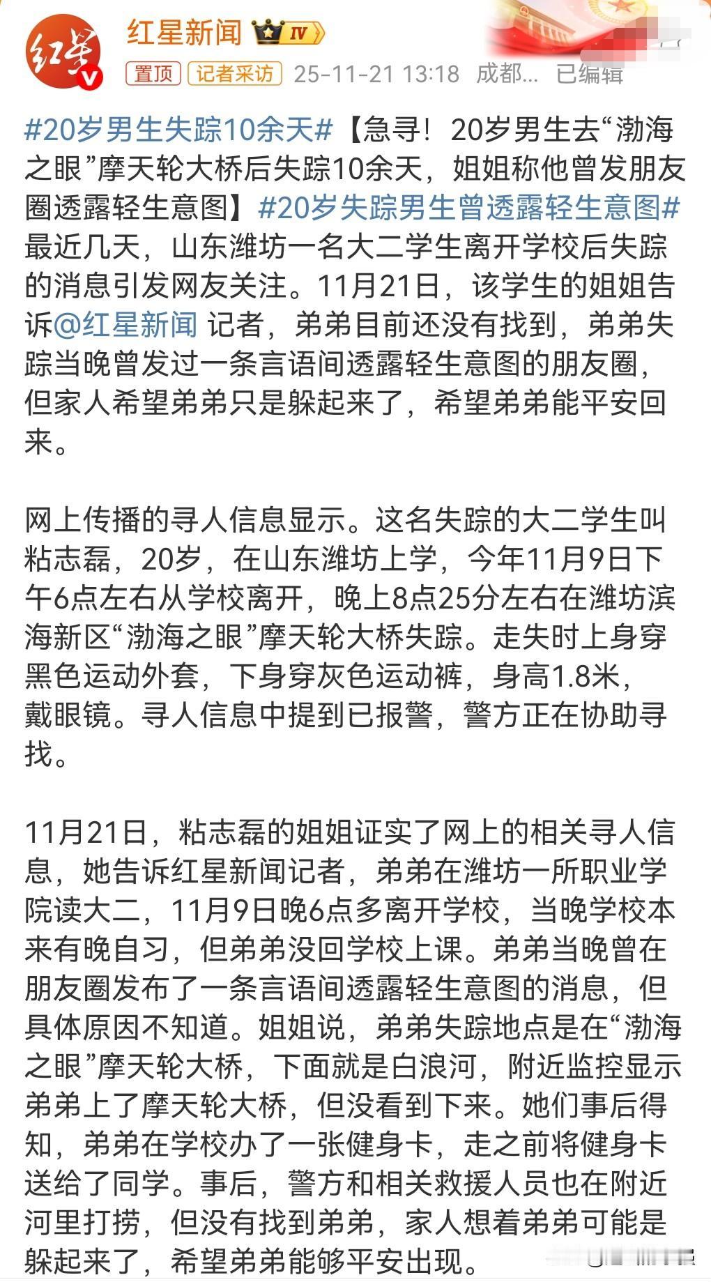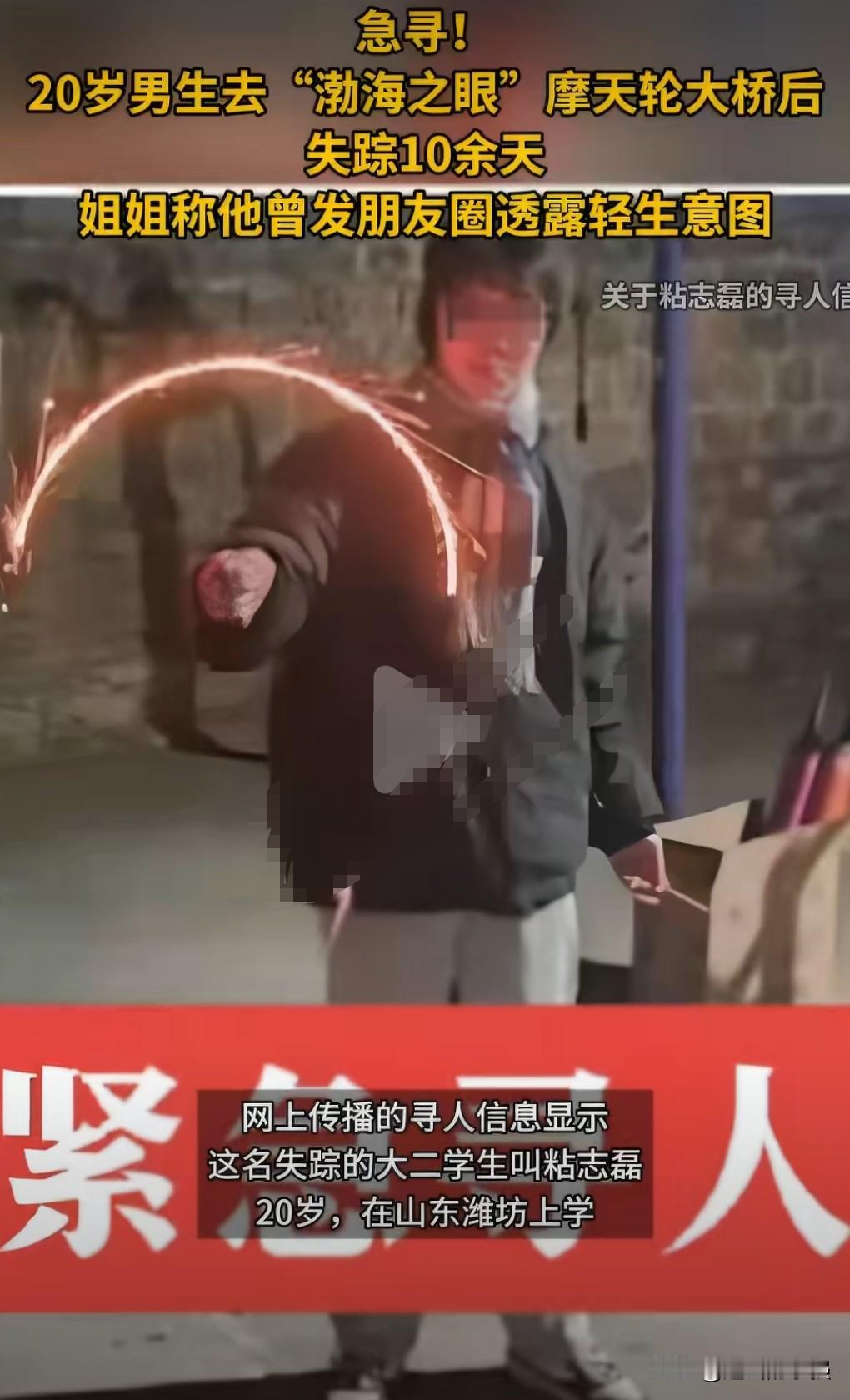 这人真的是太让人担心了,20岁男生失踪10余天。 为什么让人担心?因为这名男子曾经来到了某摩天轮大桥。 这地方就是让人感觉不妙,男子曾经流露出想要轻生的意图。 这就更让人担心了。 真心的希望男生只是躲起来了,希望他没有做傻事。 为什么有些学生老是会出现抑郁的情况,这真的值得深思啊。