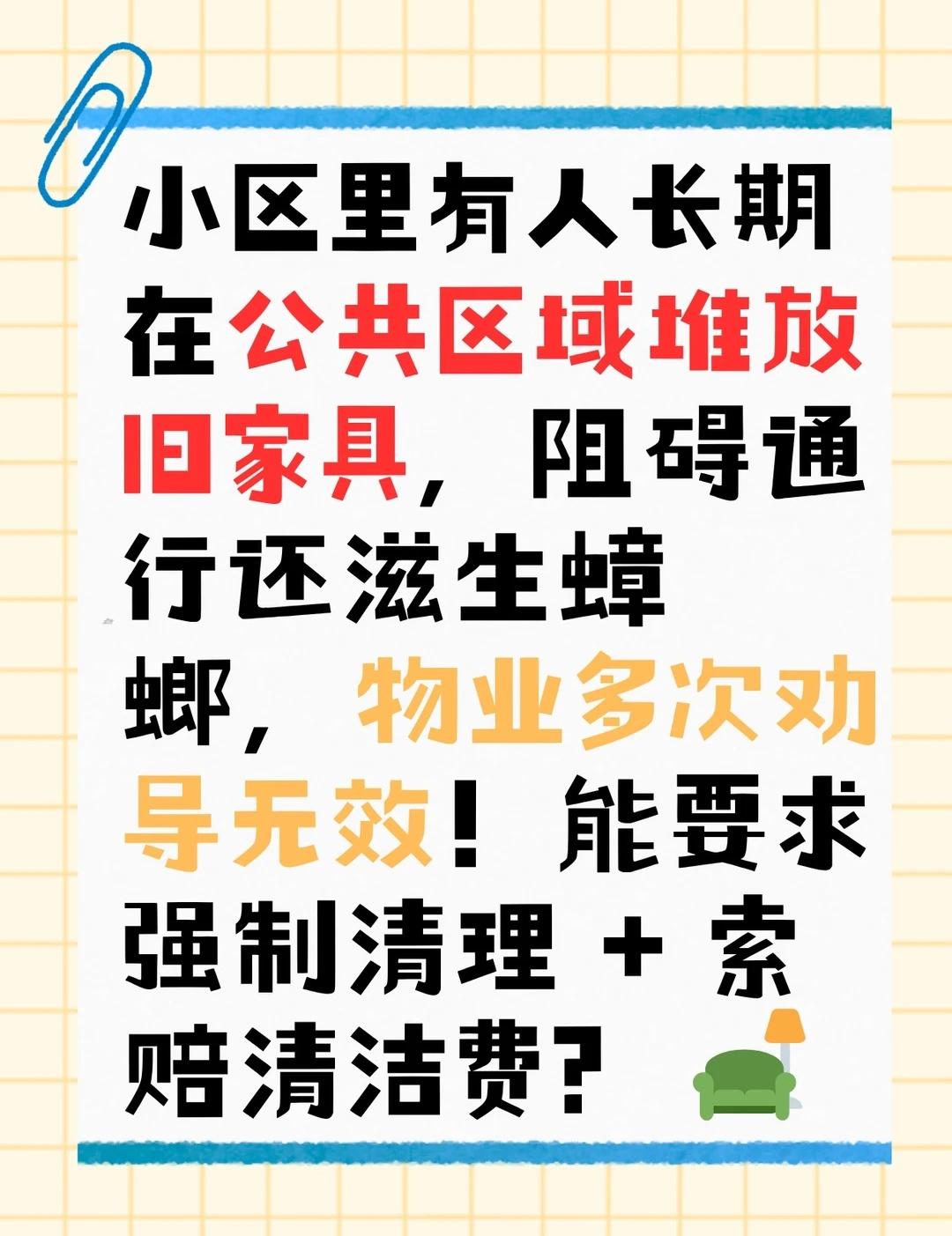小区公共区域堆旧家具还拒清?可要求强制清理 + 依法索赔清洁费 核心结论:完全可以要求对旧家具强制清理,若因堆放旧家具产生额外清洁支出或消杀费用,也能依法索要该笔清洁费。这种堆放行为既侵犯业主共有权益,还违反消防法规,物业劝导无效时可通过执法部门强制处理;因堆放物滋生蟑螂等产生的清洁消杀开销,理应由堆放人承担。 法律依据:《民法典》规定小区公共区域属全体业主共有,业主不得侵占公共区域损害他人权益,堆放旧家具阻碍通行已构成侵权;《消防法》明确禁止占用、堵塞疏散通道,违规者可被处罚,拒不改正的可强制执行。同时,依据民事侵权相关规定,堆放人因自身过错导致需额外清洁消杀,需承担由此产生的费用;而《物业管理条例》中也明确物业有维护公共区域秩序和卫生的义务,劝导无效时应配合业主对接相关部门处理。 3 步维权:①固定证据,拍摄旧家具堆放阻碍通行的照片、滋生蟑螂的影像,留存物业多次劝导的记录,若自行请人清洁消杀,保留好服务合同、付款凭证和收据;②申请强制清理,联合其他业主向城管或消防救援部门投诉,提交证据说明情况,要求依法对旧家具强制清理,相关执法部门可对堆放人处以罚款;③索要清洁费,拿着清洁消杀的支出凭证与堆放人沟通索赔,协商无果可凭证据向法院起诉,也可要求业主委员会协助出面追责,若物业未履行管理义务导致损失扩大,还可一并要求物业承担相应补充责任。正能量 杭州律师咨询 杭州律师事务所 杭州律师 知识分享 杭州律师咨询 杭州律师 物业 物业管理