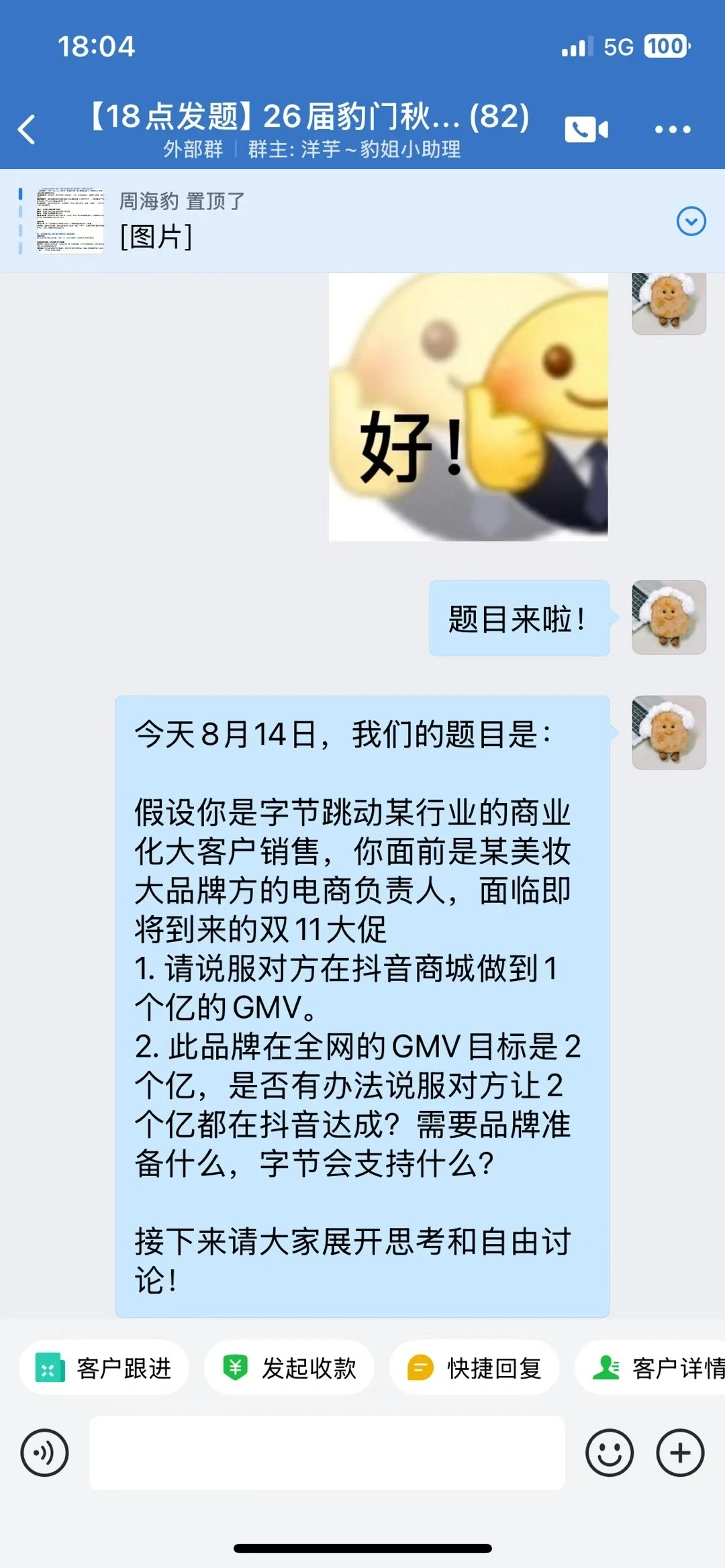 今天8月14日,我们的题目是: 假设你是字节跳动某行业的商业化大客户销售,你面前是某美妆大品牌方的电商负责人,面临即将到来的双11大促 1. 请说服对方在商城做到1个亿的GMV。 2. 此品牌在全网的GMV目标是2个亿,是否有办法说服对方让2个亿都在达成?需要品牌准备什么,字节会支持什么? 接下来请大家展开思考和自由讨论!
