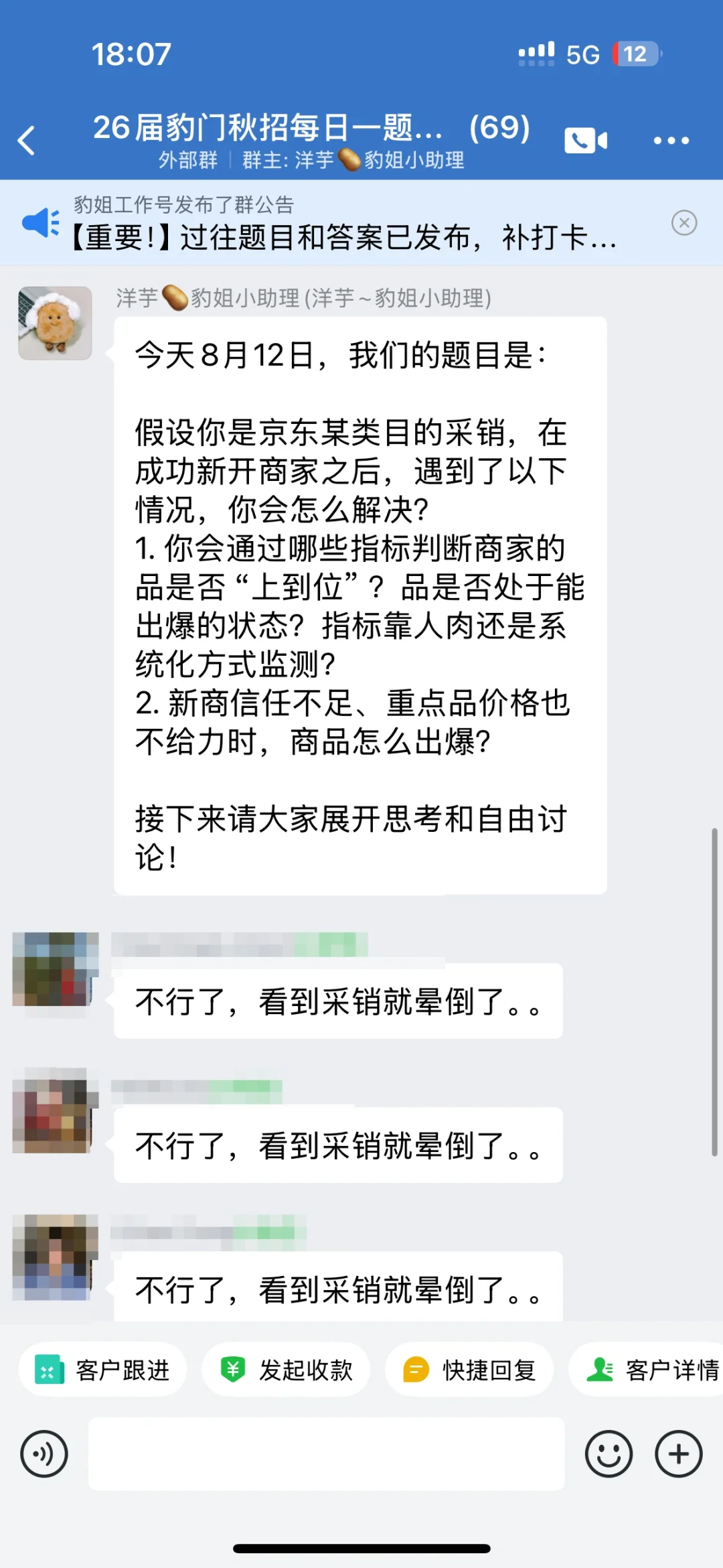 今天8月12日,我们的题目是: 假设你是京东某类目的采销,在成功新开商家之后,遇到了以下情况,你会怎么解决? 1. 你会通过哪些指标判断商家的品是否 “上到位” ?品是否处于能出爆的状态?指标靠人肉还是系统化方式监测? 2. 新商对平台信任不足、重点品价格也不给力时,商品怎么出爆? 接下来请大家展开思考和自由讨论!答案见P1~