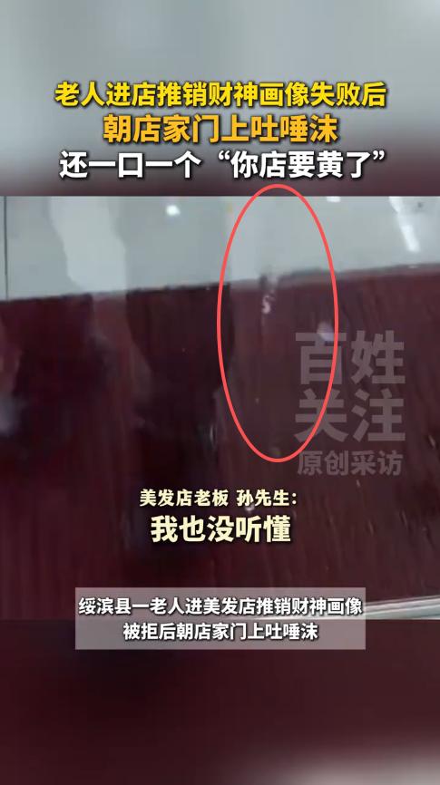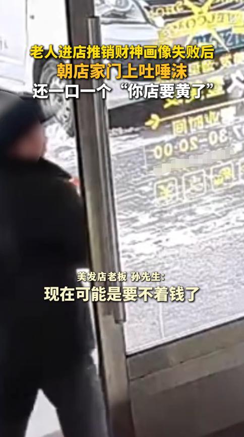 “太缺德了!”11月19日,黑龙江鹤岗,一老人沿街推销财神画像,见男子不愿购买,老人就往玻璃上吐口水,随后一边冲着他喊“你店要黄了”,一边挥舞拳头!男子听后气不过,直接追出去驱赶。网友:最起码没空着手要钱! 老板开门做生意,自然希望生意兴隆,但面对那些上门推销的套路,大家也都是门清,故意把没有用的东西夸得天花乱坠,如果不买立即就暴露出原形。 当天中午,孙先生正在自己的美发店里休息,突然,一名说着外地方言的大爷推门而入,向孙先生推销起手中的财神画像,但具体卖多少钱,孙先生并没有听清。 不过这玩意对于孙先生来说并没有用,他觉得生意好不好,和挂不挂这些画像没有关系,于是就拒绝了老人。 没想到老人直接情绪失控,大喊“你店要黄了!你店要黄了!”随后还朝着玻璃门上吐口水。 孙先生非常生气,自己不买东西也用不着这样吧,就这样的态度,怎么可能卖得出去,果不其然,等到孙先生追出去时,老人又被隔壁店拒绝了,也是在门口大喊“要黄了!要黄了!” 网友看后表示,这老头不会真把自己当财神了吧,自己的几句话要是这么好使,那还出来卖东西干嘛,直接躺在家里面赚钱不就行了! 信息来源:《老人进店推销财神画像失败后朝店家门上吐唾沫,还一口一个“你店要黄了”》百姓关注