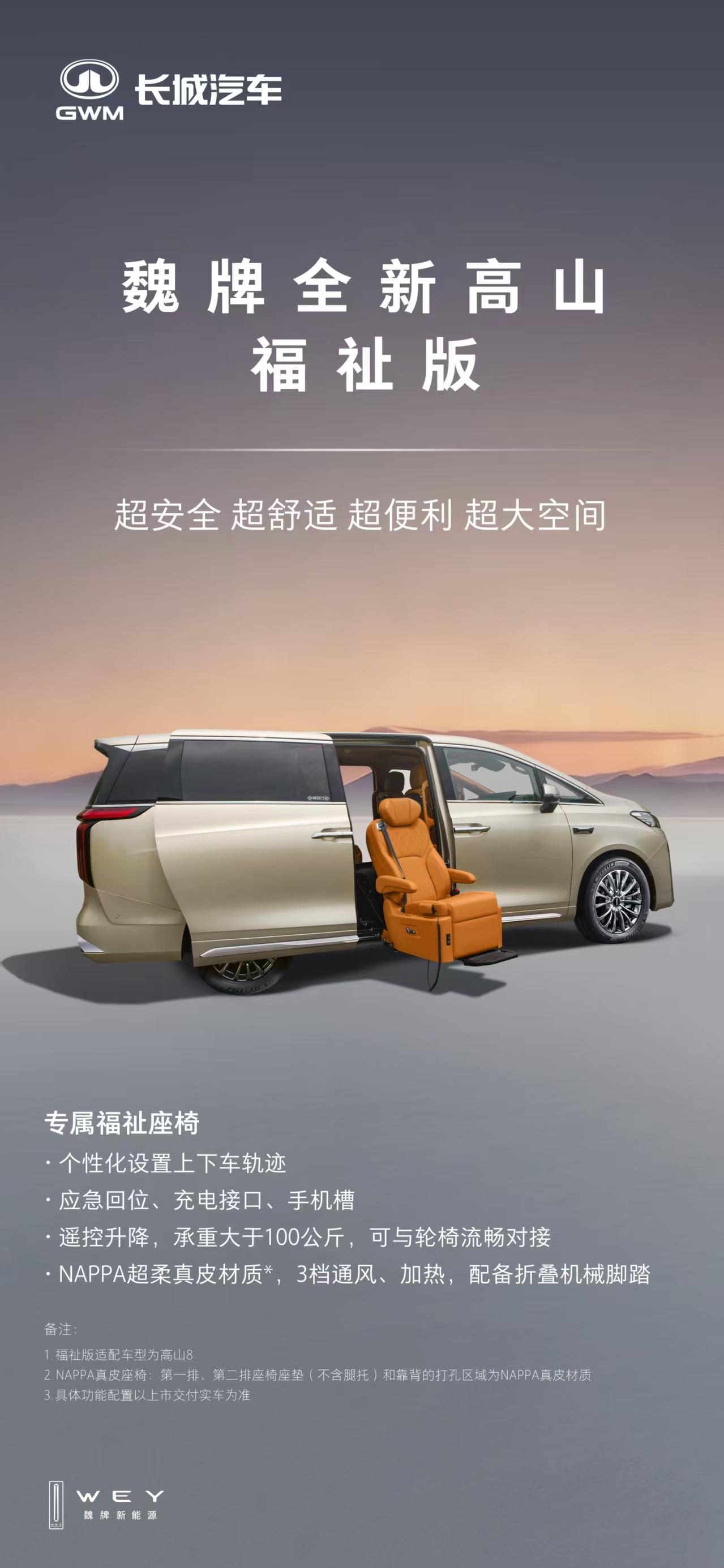 4月21日,以“开启MPV家庭新时代”为主题的魏牌全新高山预售发布会在上海举行。作为面向家庭用户的豪华MPV产品,魏牌全新高山不仅在高阶辅助驾驶、超级智舱等豪华配置上全系标配,还在大家看不到、摸不着的地方下足功夫,坚守长城汽车“良心造车”的底线。 本次全新高山预售发布会上,共发布两款车型价格,其中高山8 32.98万元、高山9 37.98万元。魏派长城汽车