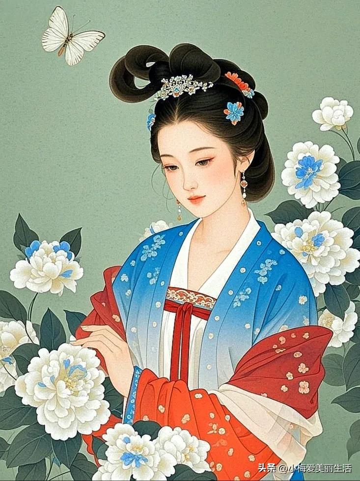 花间美人,蝶舞翩翩。 蝶吟花间醉三春林间粉裳美人蝶舞花绽花间古韵花间女