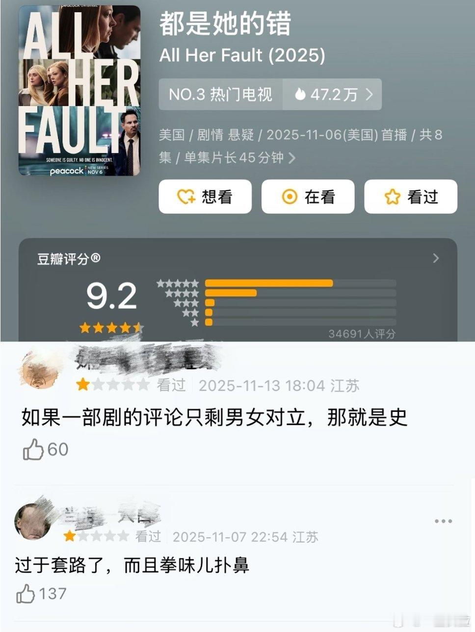 看了一下给All Her Fault打一星的评论 好好笑bor被剧名骗进去以为是骂女人的,结果是骂自己的