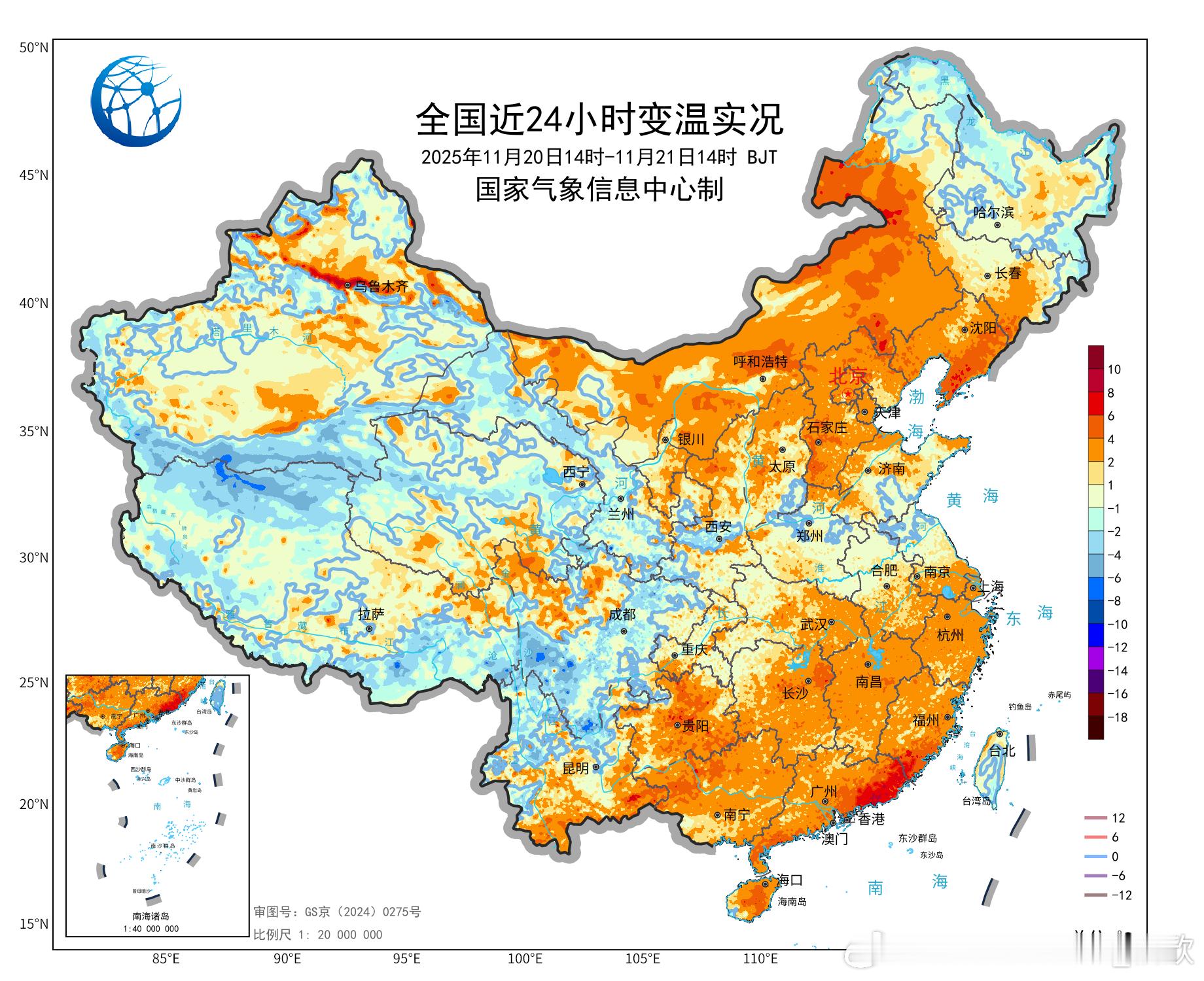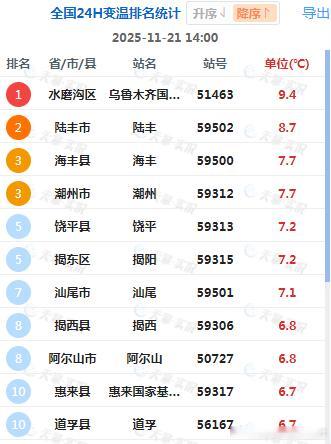 【升温】今天14时对比昨天14时,我国中东部以及新疆天山沿线大多升温。乌鲁木齐老国家站(51463站)升9.4℃、广东陆丰升8.7℃、海丰升7.7℃、潮州升7.7℃、饶平升7.2℃、揭阳升7.2℃,为14时升温前5站点。