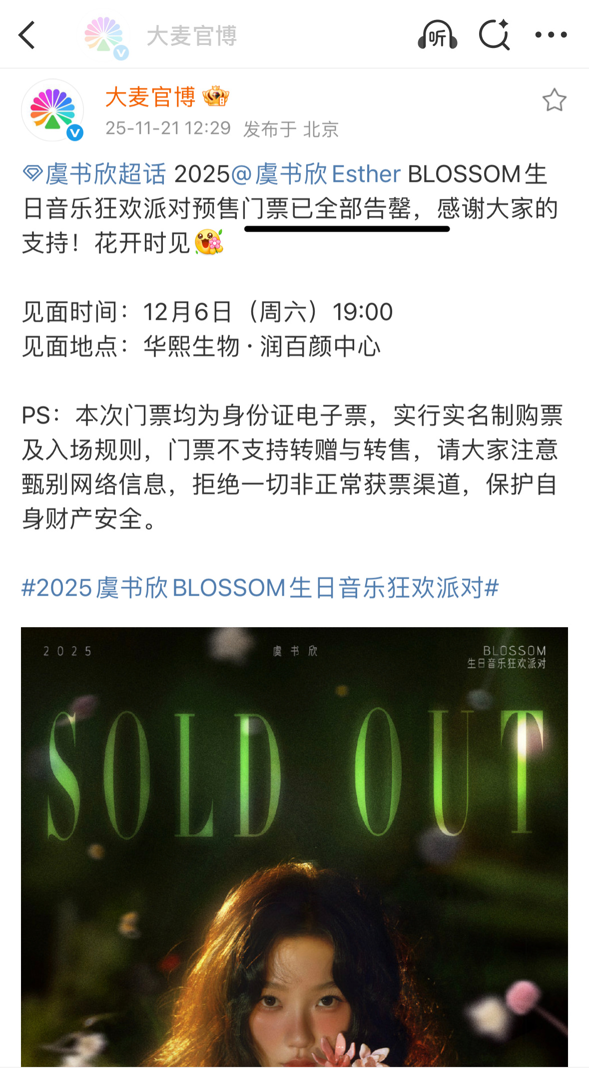 大麦官博发了虞书欣生日会门票售罄了…估计无回流票了粉丝太多了…