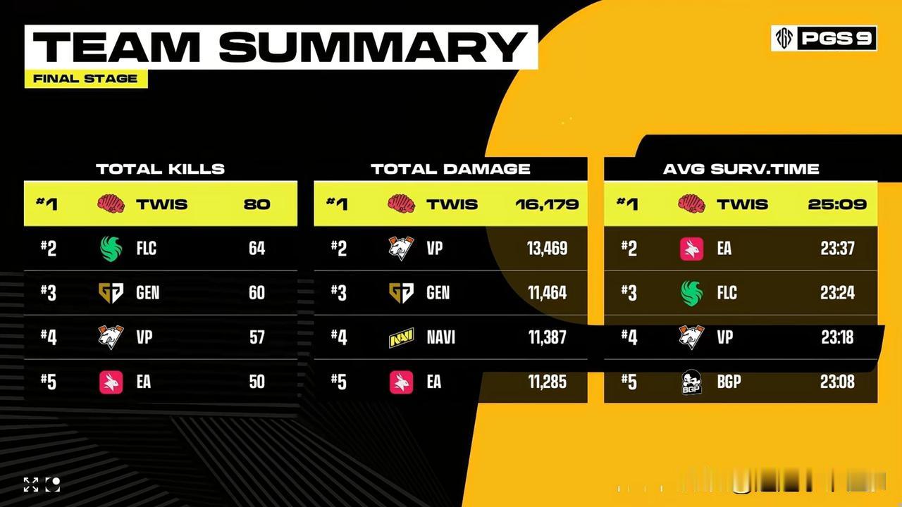 感觉可以颁奖了! PGS9全球系列赛总决赛第二天比赛结束! TWIS第一、FLC第二、VP第三、GEN第四 4AM第五、17第十 榜一大哥TWIS目前优势来到24分,从他们的整体实力以及队伍纪律性来看,感觉明晚六场比赛不会翻车,大概率又要捧杯了,要四冠 4AM状态还是一般或者说实力就这样?今天比较可惜的那把天命吃鸡局没能把握住,不然搞个前三还是稳的,最后前八问题不大 17终于在下班局完成吃鸡,目前是追到第十名,距离第八名只有3分,希望两个队伍都能进前八吧!