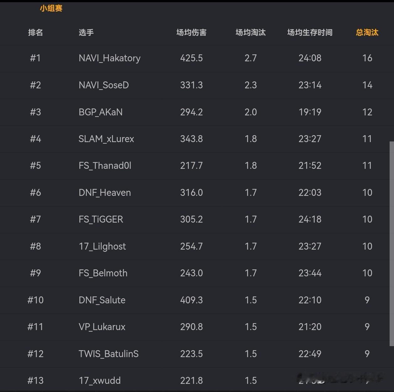 17稳,4AM、CTG危! PGS10全球系列赛小组赛首日比赛结束! NAVI第一、DNF第二、FS第三、SAG第四 17单日47分排名第五,基本上是一天下班了,后面6场比赛还是比较轻松的,真稳 4AM单日18分,比PGS9首日得分高一点,但还是需要那样的爆发和剧本,今天六场比赛有两场关键没把握住,一次是被大巴老师一炮三,龙救人失败,还有一次就是小鹿、龙被摸的那把,张德胜、阿童木支援太慢,这两波要是把握住了今天的分数应该很可观 CTG感觉有点不会打了,调整了一个星期,感觉队伍状态还是一般,还有6场比赛珍惜了!