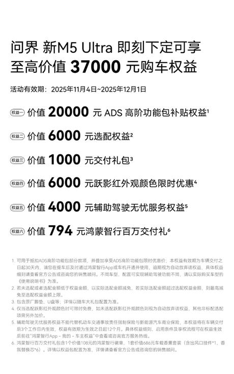 小米YU7和问界新M5 Ultra对比:三点关键体验让你不再纠结 和我一样,最近朋友看车一直在小米YU7和问界新M5 Ultra之间摇摆,说实话,这两款车确实都不错,作为已经锁单问界的车主,我想聊聊我的实际体验,为啥最后选了问界新M5 Ultra。先从购车成本来说吧,我买的时候问界新M5 Ultra有最高37794元的购车权益,包括2万ADS高阶包补贴和6000元选配基金,比起25.35万起的小米YU7,省下的钱足够家里一年多的能源开销,这点对平时顾家的人来说吸引力很大。另外,家用舒适性上,问界新M5 Ultra的舒云座椅带副驾腿托,后排空间很足,孩子坐后面腿能伸展开,后备箱也特别能装。小米YU7体验下来,加速确实猛,但底盘感觉偏硬,跑长途可能会不太舒服。辅助驾驶也是我特别看重的,小米YU7硬件也不差,但问界那套192线激光雷达+4D毫米波雷达+11摄像头的组合很入我眼,配合华为乾崑智驾ADS 4,在复杂路况上更让人踏实。再加上1440公里的超长续航,平时上下班、周末出去玩都没压力。如果你也在纠结这两款,真心建议带着家人实际去开一开,试完心里就有数了。