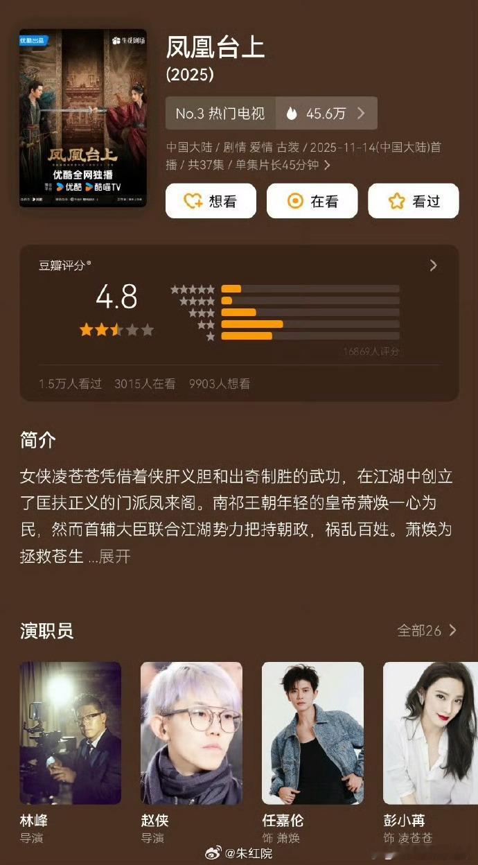 任嘉伦彭小苒《凤凰台上》豆瓣 4.8 分,快节奏强冲突的设定获认可,彭小苒微醺独酌戏凸显角色深度。
