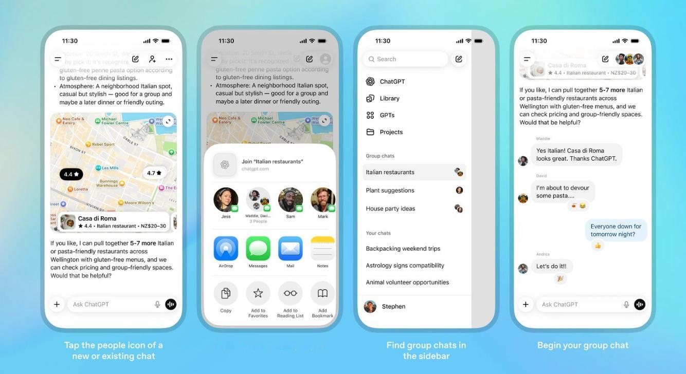 ChatGPT 上线群聊功能可还行,能创建共享对话空间并邀请好友、家人或同事加入。知道你们想问什么,群聊与私密对话相互独立,个人 ChatGPT 记忆不会与聊天成员共享。