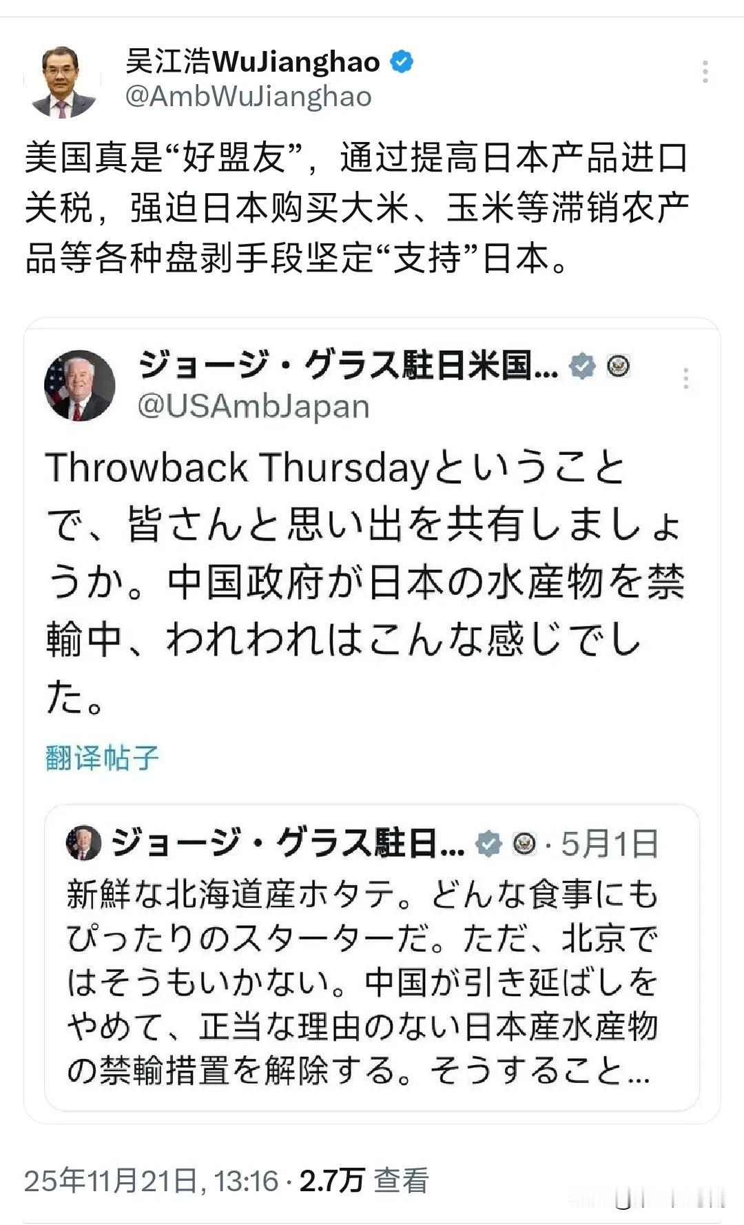 中国驻日本大使吴江浩今天(11月21日)发文写道:“美国真是‘好盟友’,通过提高日本产品进口关税,强迫日本购买大米、玉米等滞销农产品等各种盘剥手段坚定‘支持’日本。” 评几个 吴江浩大使这番话,直接把美国“塑料盟友”的遮羞布撕了个粉碎。美国这波操作,翻译过来就是:刀子我用,锅你背,好处我全拿,亏你全吃。一边对日本汽车、钢铁加税加到飞起,一边把滞销大米、玉米强塞给日本,这哪是“盟友”,分明是“霸王餐”加“强买强卖”的组合拳,把“薅羊毛”写进了美日同盟的DNA。 更魔幻的是,美国驻日大使还有脸跳出来对中国禁运水产品“义愤填膺”,转头却对自家关税大棒和农产品倾销选择性失明——这双标程度,连“川剧变脸”都得甘拜下风。日本这边呢?一边被美国当“血包”抽,一边还得笑着配合演出“日美亲善”,堪称国际政坛的“顶级韭菜”。说到底,美国这“盟友”当得比渣男还渣:需要你时“小甜甜”,不需要时“牛夫人”,关键时刻还得替“老大”挡枪子儿。吴江大使这波输出,简直是给日本递了面镜子:再不清醒,就真的被卖还帮人数钱了。