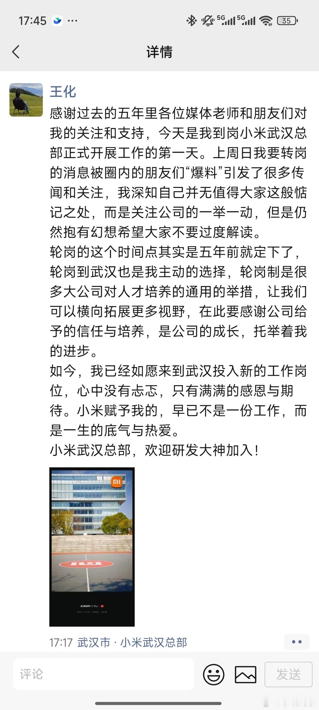 小米公关一号位 个人朋友圈表示,转岗武汉是五年前就定下来的。而且轮岗去武汉也是他的主动选择。好了,那些就盼着小米出事的黑子们不用等瓜了,估计今天新的接任者就会公布了。
