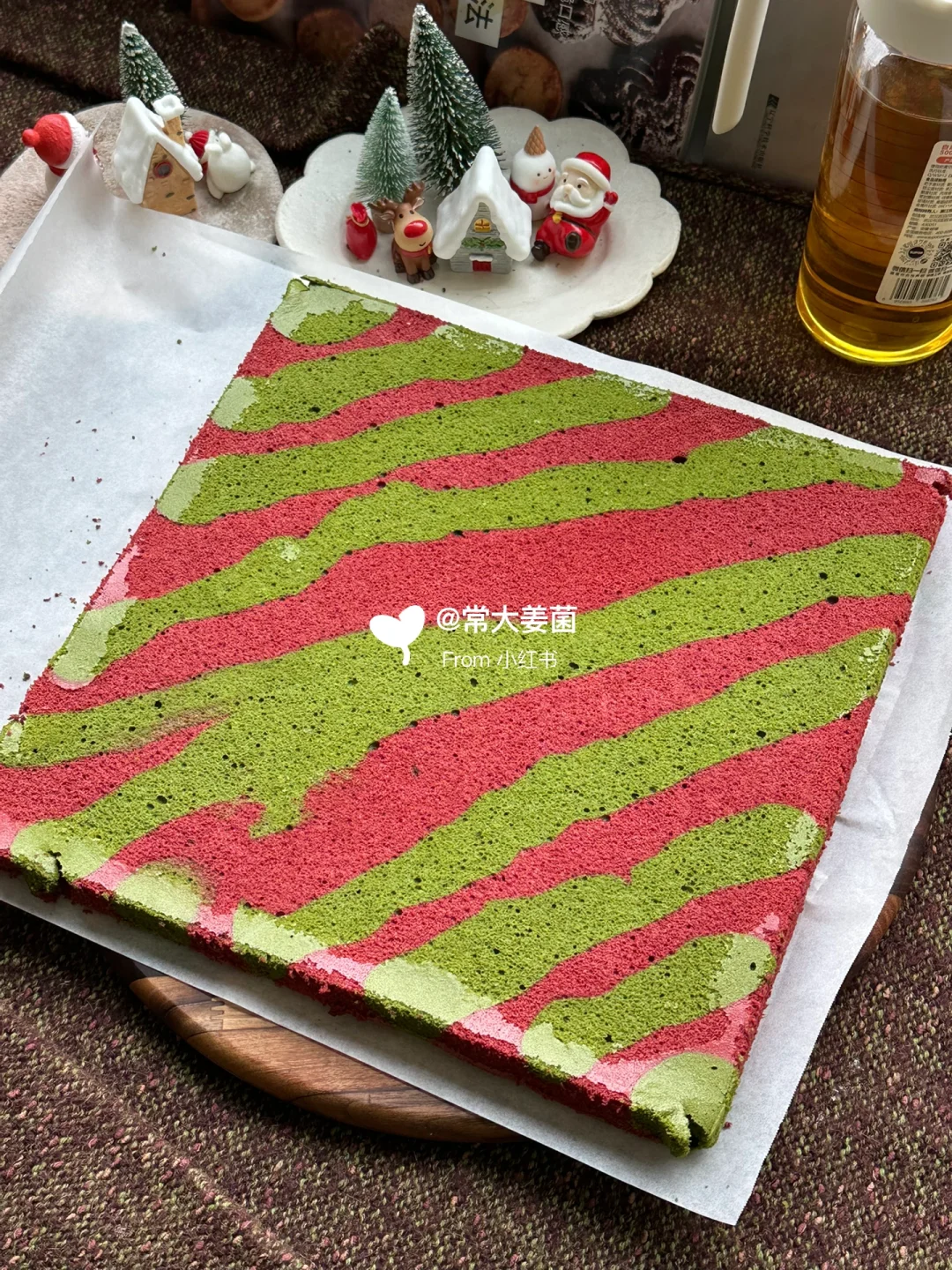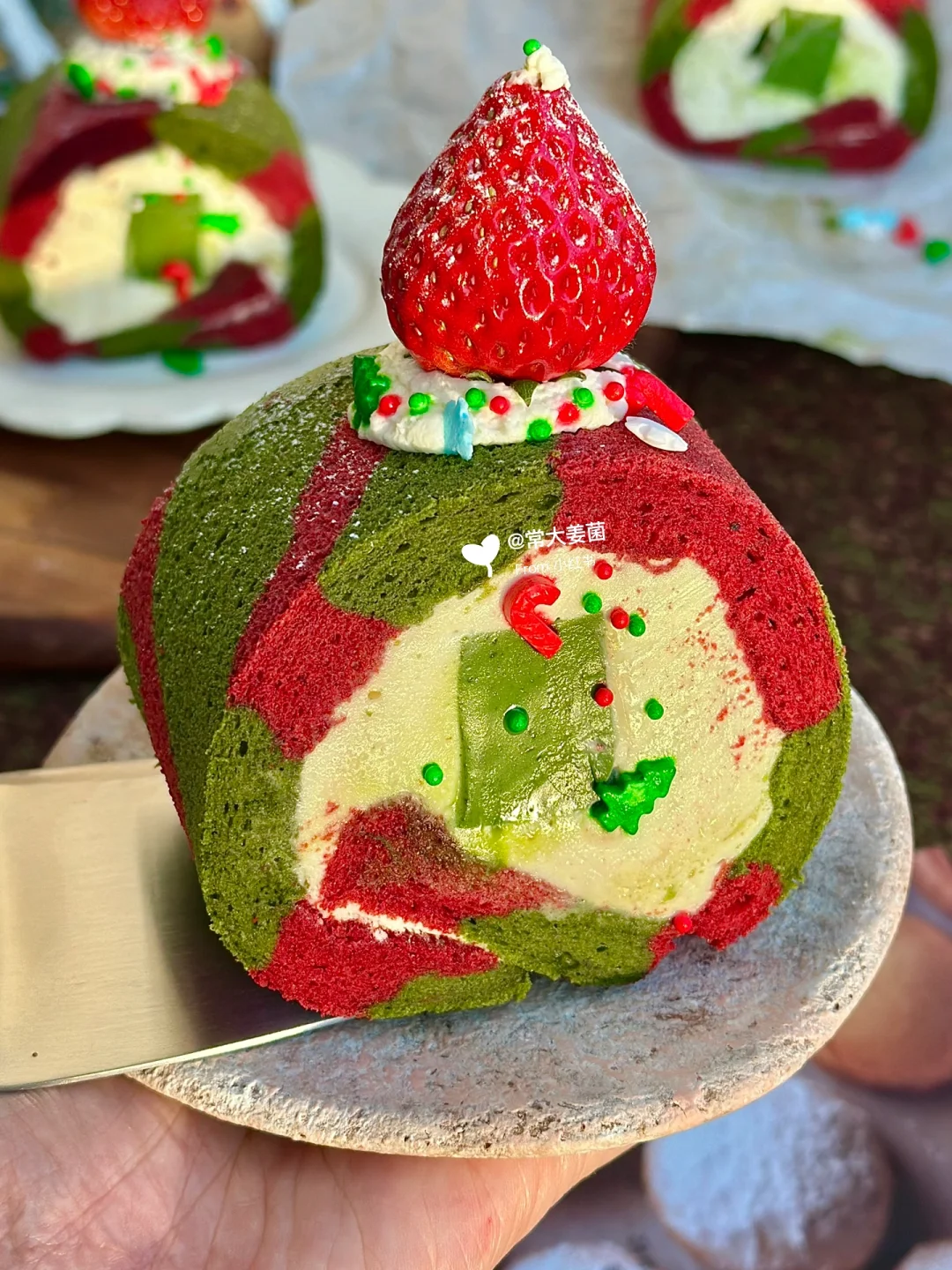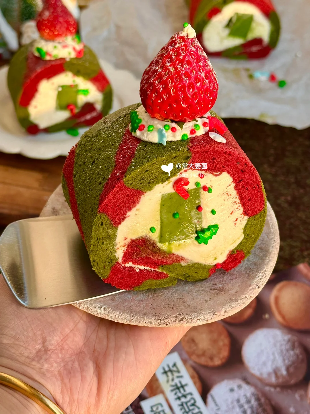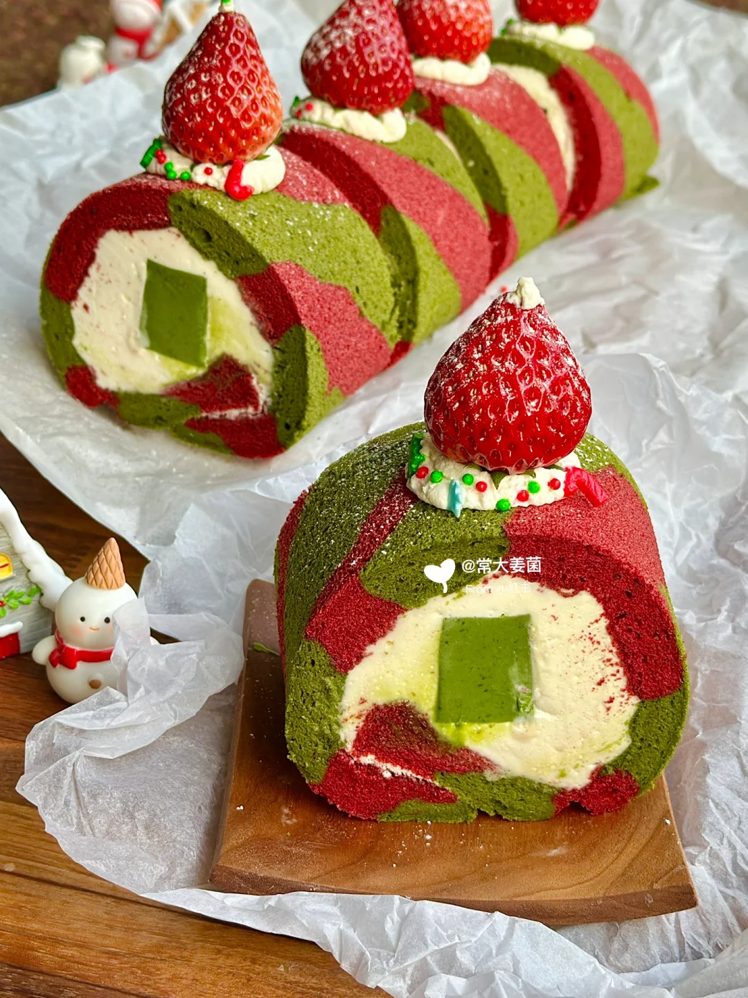 今天是圣诞主题的《红丝绒抹茶双拼蛋糕卷》 +里面夹了俺天命🍵🍮低糖浓郁抹茶奶冻! +顶上放了草莓🍓 +🧀特调了马斯卡彭奶油夹馅~ +被抹茶&红丝绒蛋糕胚包裹着, 一口一口吃出心里冒花儿嘿嘿🌸 除了味道,那氛围感也爆棚,让人喜爱的不舍得吃🥰 提前祝大家圣诞快乐🎉🎄🎅🏻