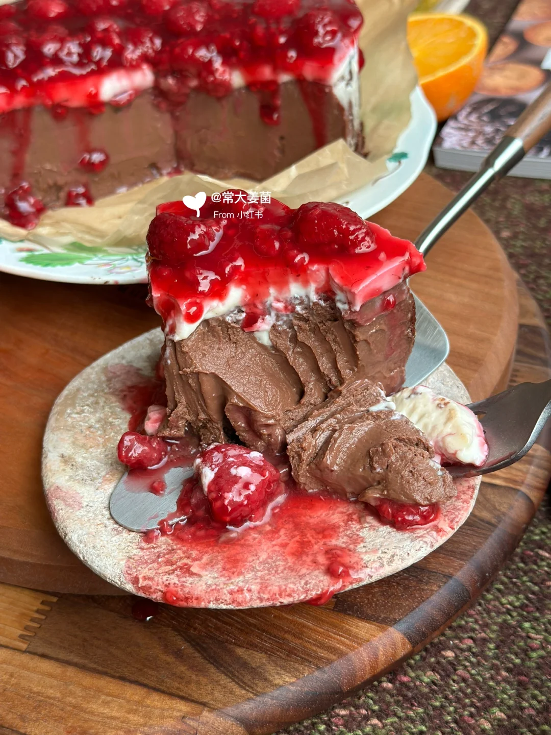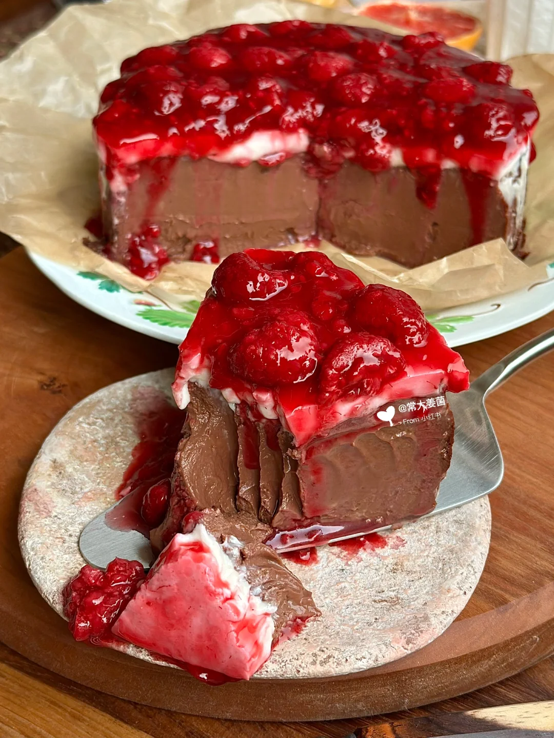 这黑巧味浓醇到顶脑门儿, 谁吃了都得叫绝!! 用到浓醇的85%黑巧,糖给量刚刚好,微微苦~ 入嘴浓醇到顶脑门!!😭😭😭真·好吃哭 🍓再加上topping树莓酱,酸酸甜甜, 增加蛋糕的清爽风味, 和黑巧搭配在一起,实是高级~