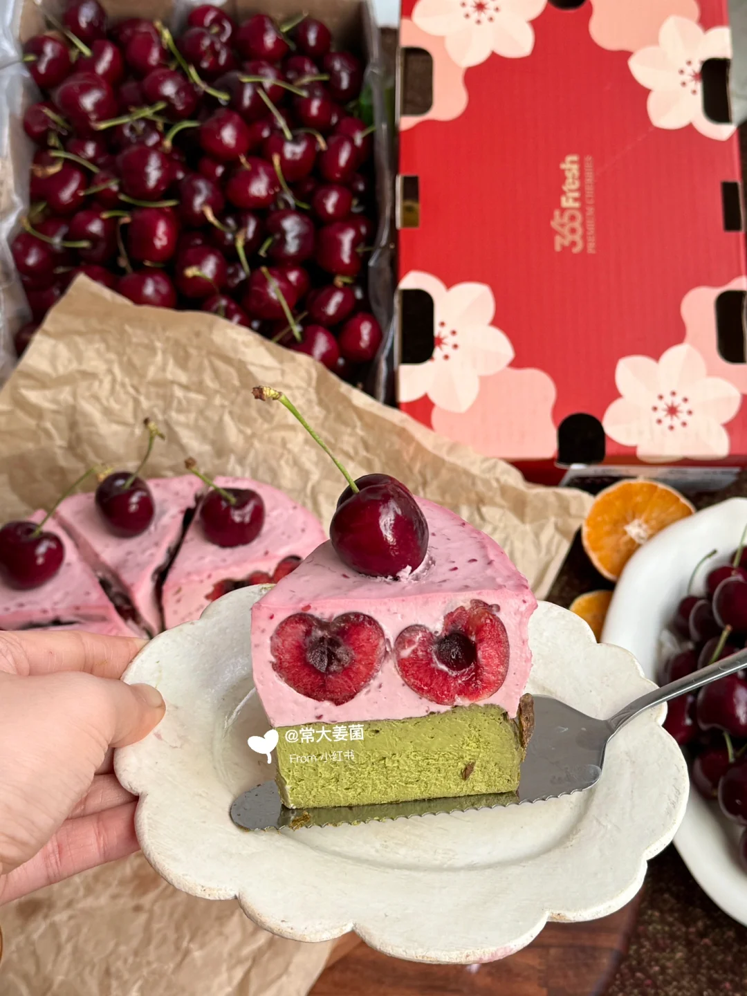 🧀一叉子下去,入嘴先是车厘子满满的甜蜜爆汁和脆爽口感,后是浓郁茶香的🍵五十铃抹茶和🧀奶酪融合的浓郁香气~