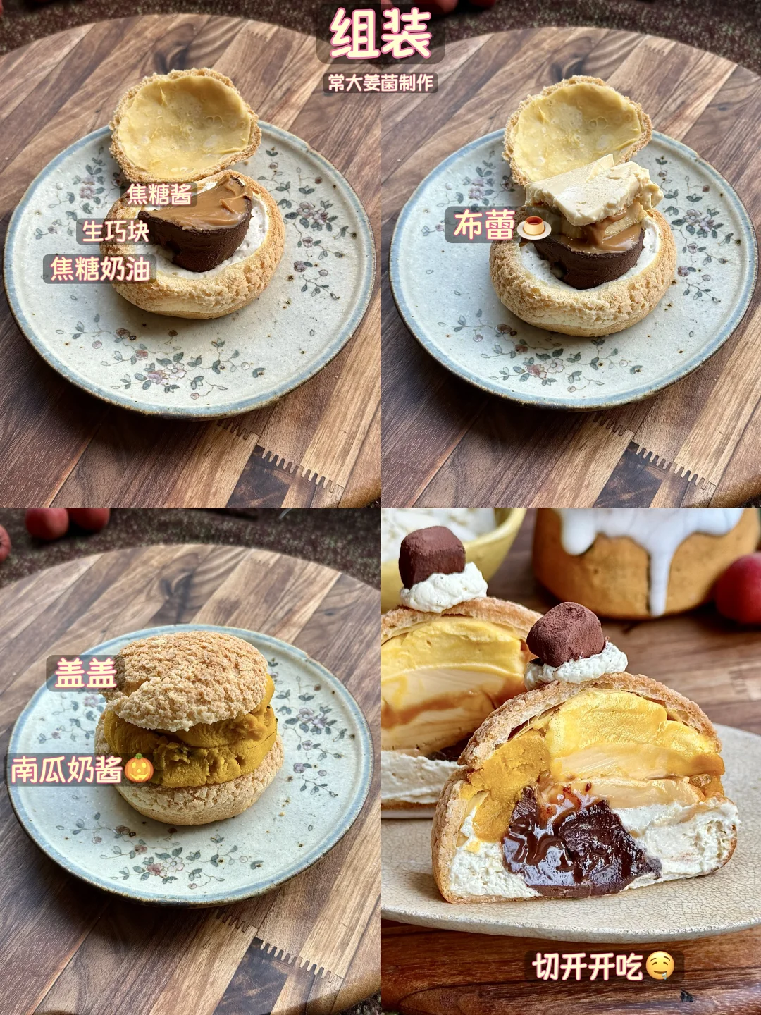 把冰箱里的边角料通通塞进泡芙体里! 意外得到一只美拉德色系泡芙!层次、口感无懈可击! 给大家提供这份🍂秋意满满的甜品搭配灵感🤗 🍫酸苦浓郁的生巧块、 🫙焦苦香的焦糖酱、 🍮蛋香浓郁的布蕾、 🎃奶香南瓜酱、 🧀淡淡甜感的焦糖奶油。 buff叠加🥹 光是想想就好吃哇!!