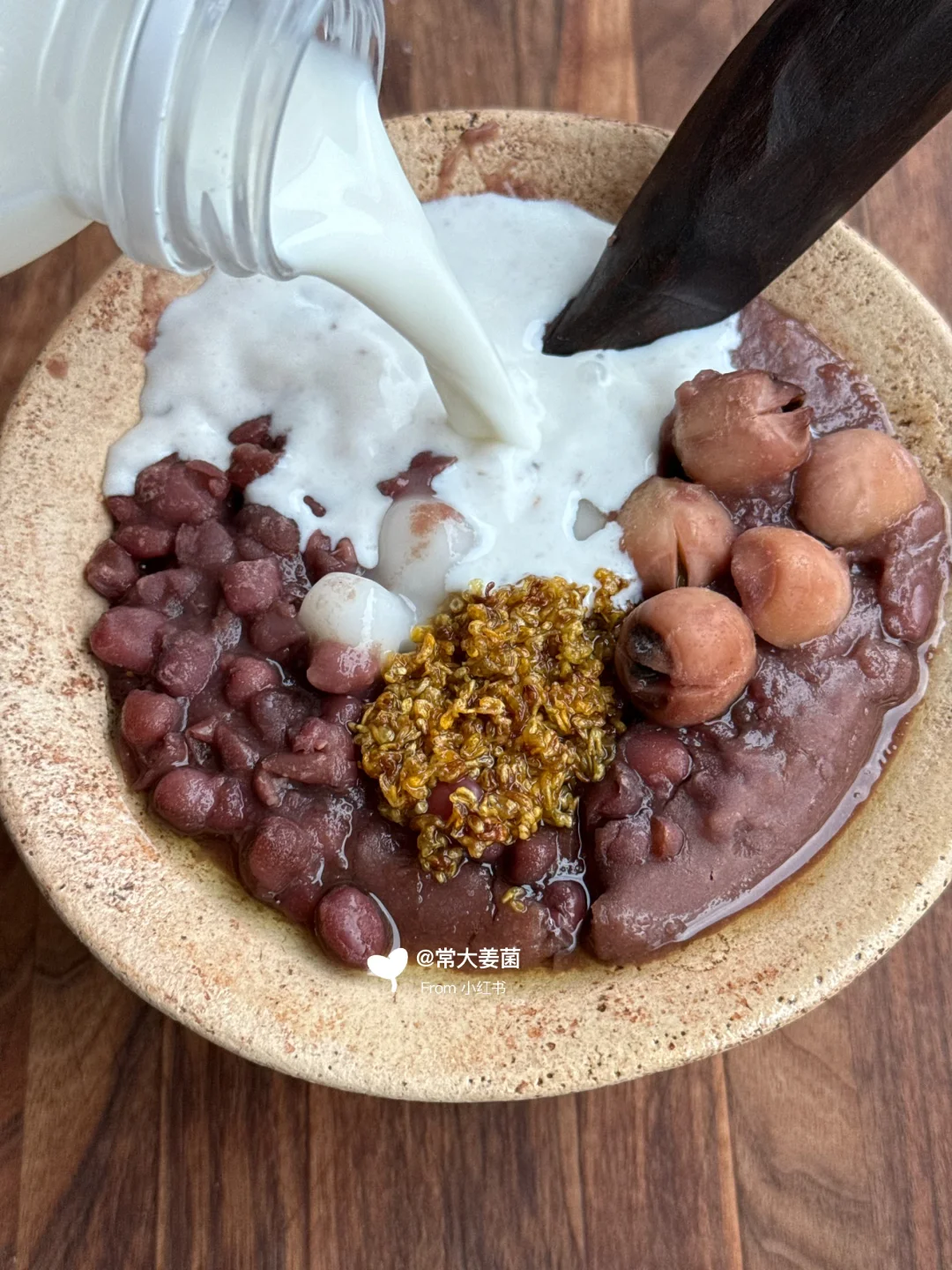 中式五红红豆沙🫘🥄: 👩🏻🍳红豆沙颗粒➕红豆沙泥➕红枣➕花生➕莲子和莲子(稳定秋天变燥的肝火)➕小米➕糯叽叽的小圆子🥰➕牛乳➕葡萄干。 9种食材熬出💯气血爆棚的中式甜品! 🙋🏻♀️女孩因为生理期,多少都有点气血不足, 🍁秋天的早上和晚上冷气已入侵,尤其中秋前后是补气血佳季 为❄️过冬做准备~争取不再做冻手冻脚的冰雪美人😉 - 有姐妹认为牛奶性凉,但是加牛奶会好喝翻倍!!🤗