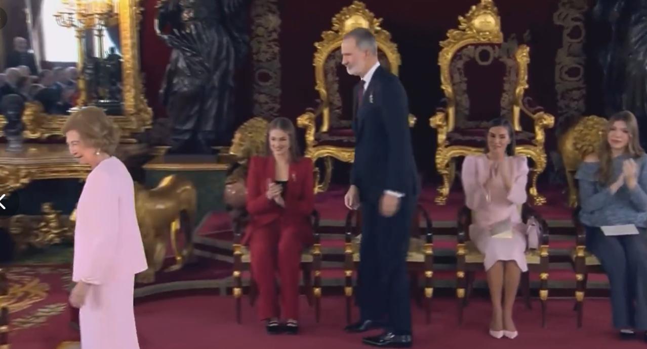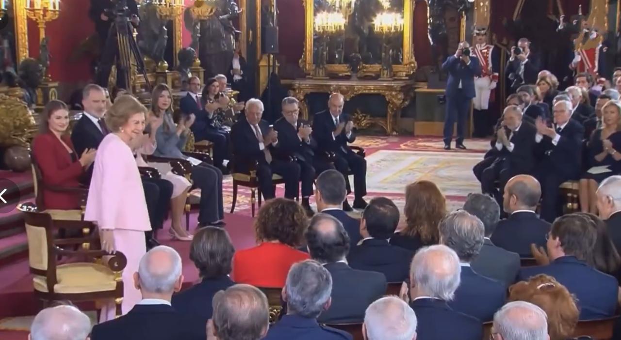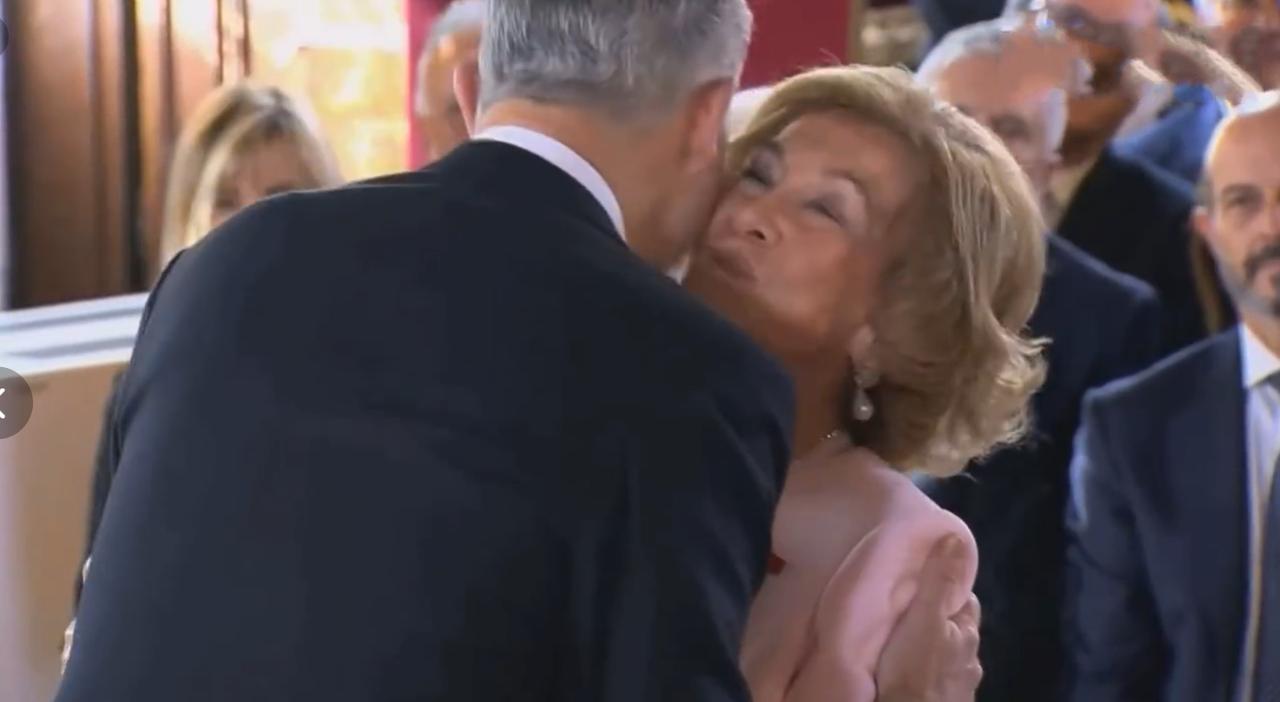 西班牙国王为母亲索菲亚颁发勋章!11月21日费利佩六世主持授勋仪式,并亲自为母亲索菲亚王太后颁发金羊毛勋章,获得这个勋章的女人少之又少,索菲亚太后是其中之一。 据悉,索菲亚太后是真正的公主,然而婚姻却不幸福,因为丈夫出轨,她为了让儿子当上国王付出很多,如今儿子费利佩是西班牙国王,还亲自为老母亲授勋,让王太后很感动。 只见王太后穿着一身粉嫩的时装裙,和国王儿子贴脸拥抱,儿媳莱蒂齐亚以及俩孙女也都在场,全场还响起了热烈掌声,祝贺索菲亚太后获得金羊毛勋章。