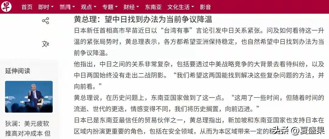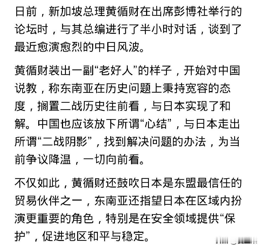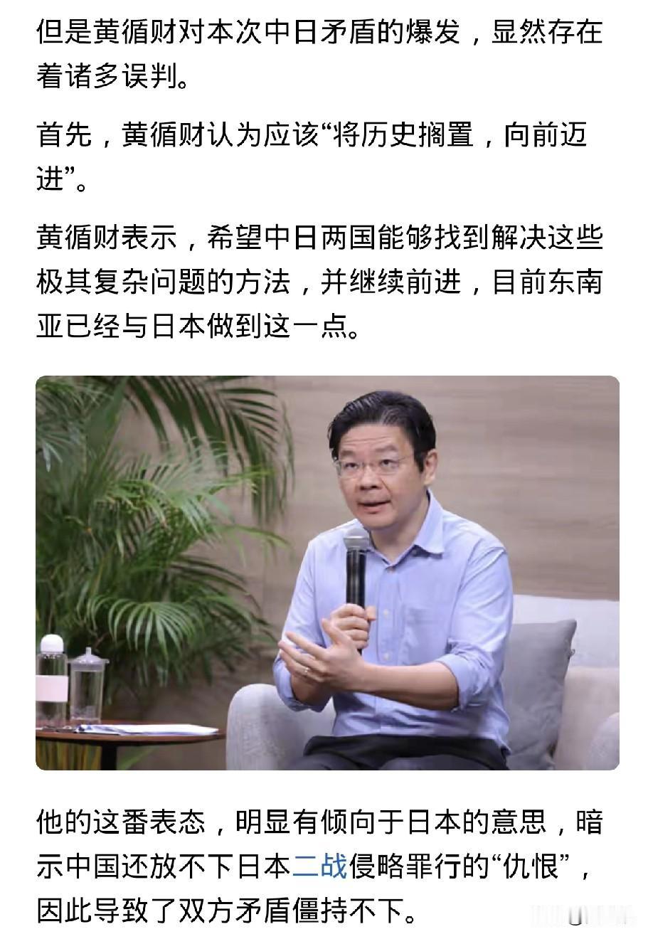 新加坡总理黄循财来当和事佬了。 他说日本已经在主动缓和了,中国不要死咬不放,别把事闹大了。 听着像是讲和的,实际上在为日本说话。 日本主动缓和的行为在哪里? 反而在加速扩展军备。 二战备受日本侵略蹂躏的新加坡可能忘了自己的痛, 这位总理自然是不痛的,因为当时新加坡本就是英国的殖民地,所以骨子里谁殖民不是殖民呢。 这就是他太不了解中国了,所以怎么能理解独立自主、保家卫国呢?