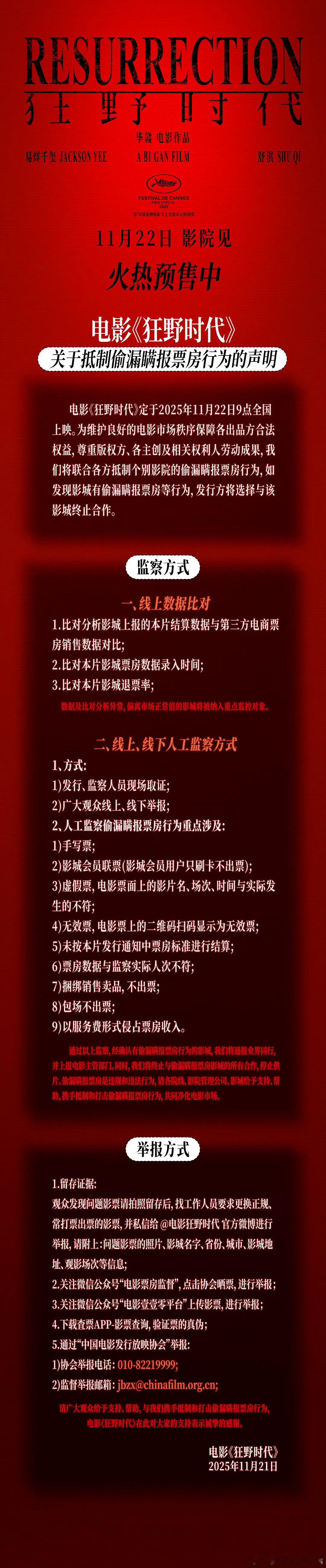 狂野时代抵制偷漏瞒报票房行为声明,支持,