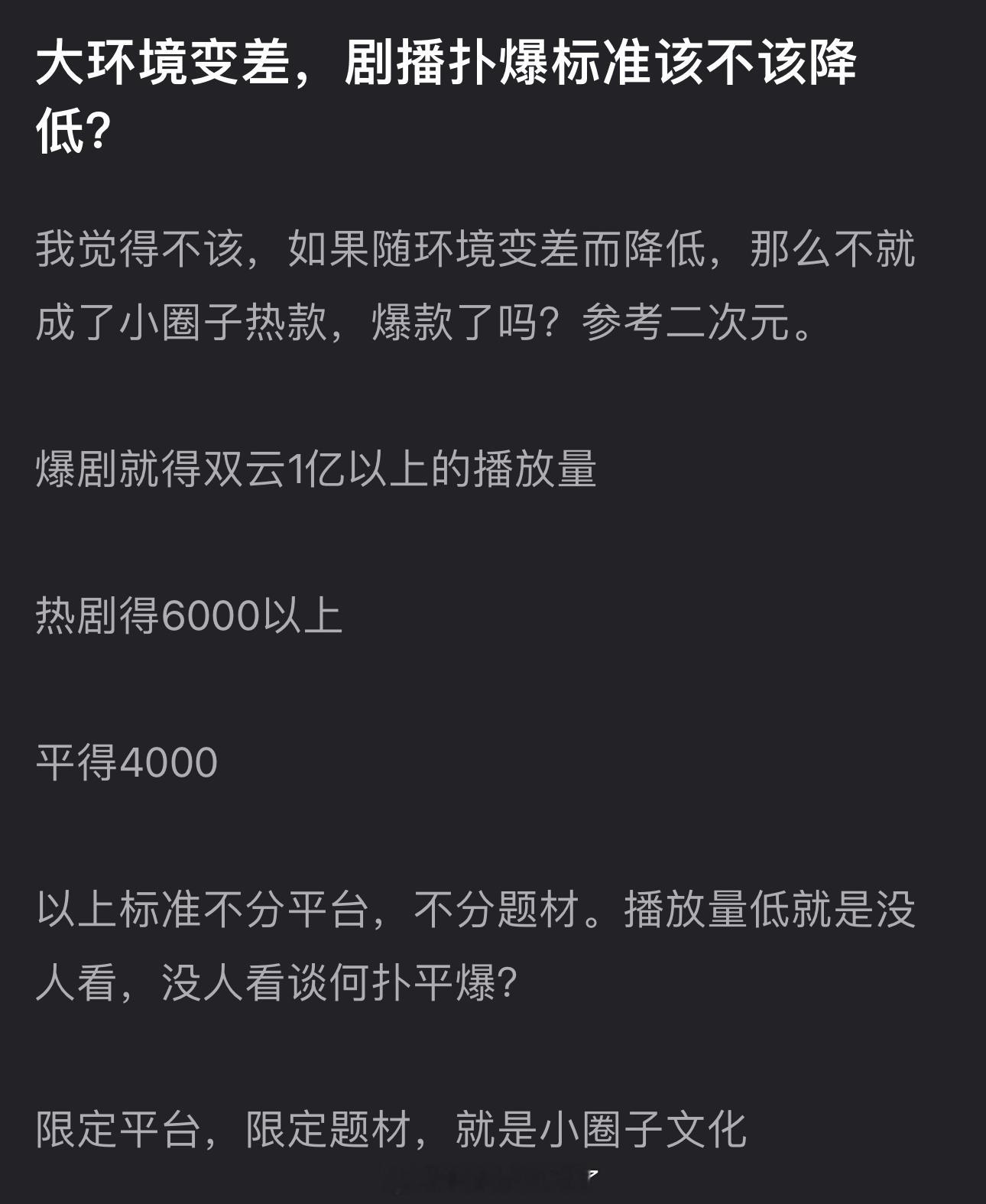 大家感觉大环境变差了剧播扑爆标准该不该降低?
