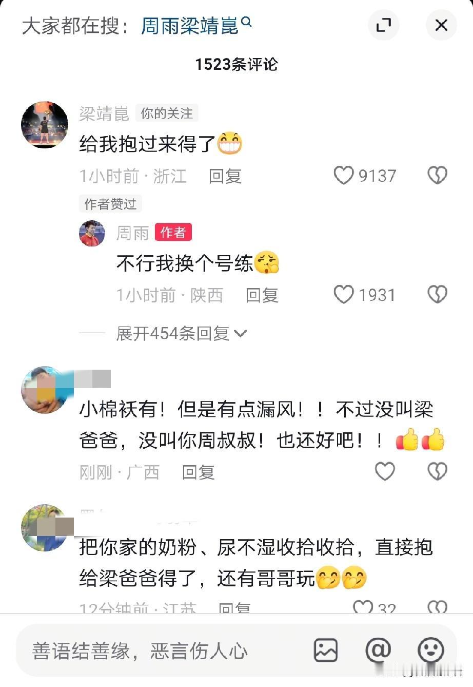 周雨的小棉袄漏风了,只喜欢梁叔叔。 十一自从见了梁叔叔后,就很喜欢梁叔叔,在正定训练时,周雨和他媳妇儿出去一会儿,梁靖崑过去看十一,十一就喊梁叔叔“爸爸”了,把甜甜开心的,还发给周雨炫耀一下。 不仅梁叔叔喜欢十一,美丽也喜欢十一,全运会期间,美丽带着凉皮和二宝跟十一一起玩,出去玩的时候美丽也抱着十一,都稀罕小棉袄。但是小十一更喜欢梁叔叔,看比赛的时候,说看爸爸比赛,十一不看,说看梁叔叔比赛,十一说嗯,还对着电视在喊:“爸爸加油”。 这不,全运会结束了,周雨也回来了,今天他发抖音说自己我拼命赚奶粉钱,十一半夜两点起来给梁叔叔加油,心都碎了一地。梁靖崑看到周雨的动态后,留言说:“给我抱过来得了”,甜甜这美的,想白得个闺女啊。看到其他网友跟周雨说赶紧要二胎,这个漏风有点严重。 十一这孩子真的很可爱啊,怪不得甜甜抱着的时候舍不得放下,估计也想要个漂亮闺女。