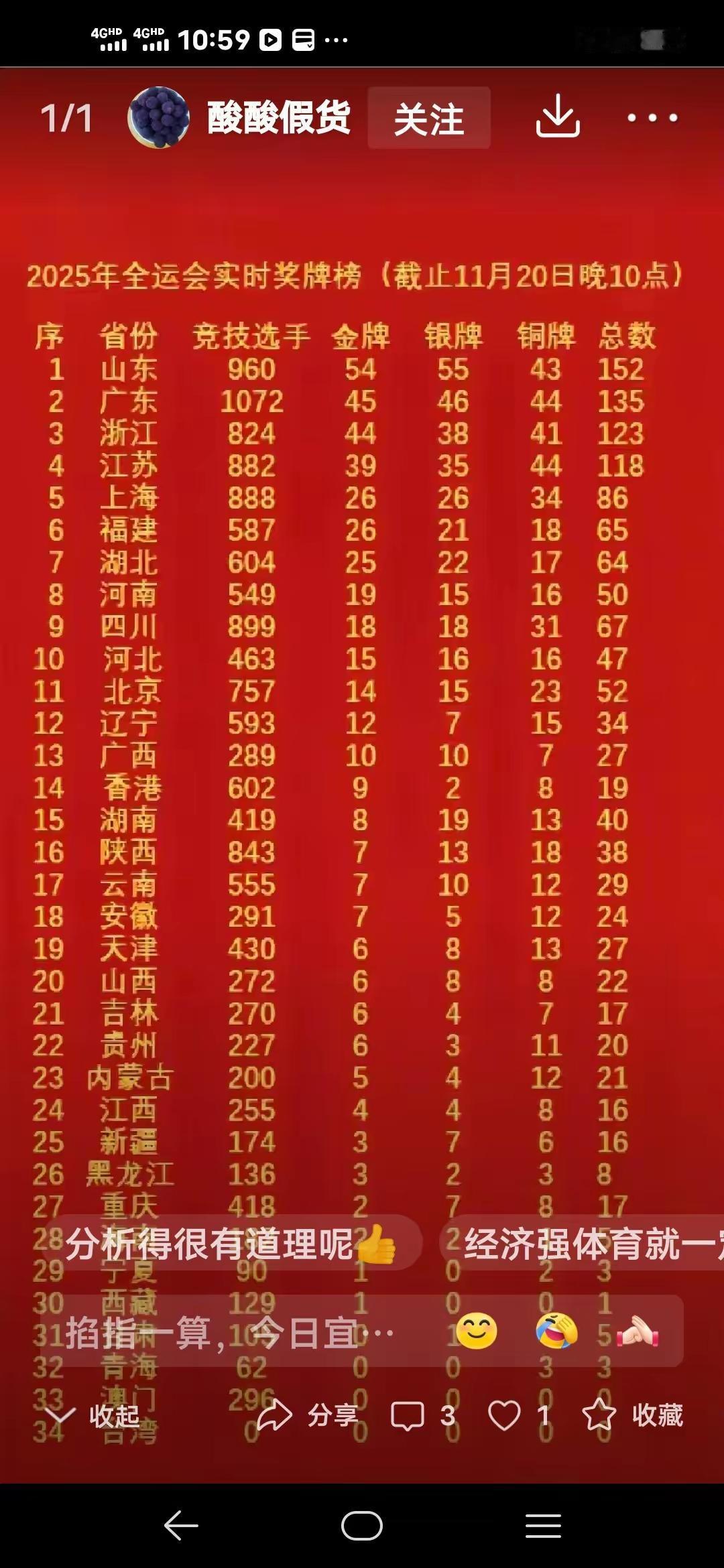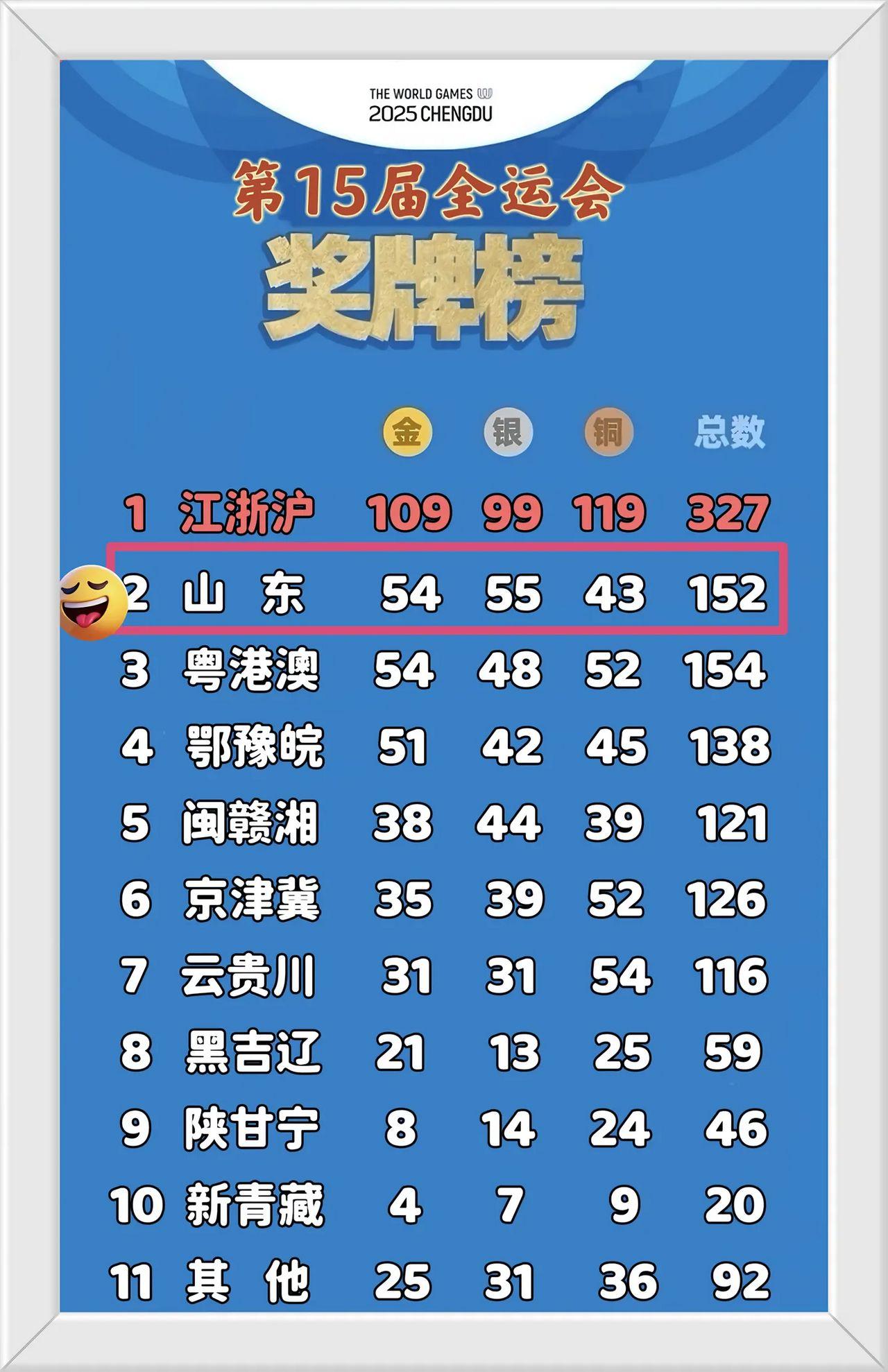 祝贺山东人民,祝贺乔云萍局长,十五届全运会山东代表团获得金牌奖牌双第一[赞][赞] 金牌54,银牌55,铜牌43,总奖牌152枚,力压主场的广东队,有人说山东那么多金牌不受待见[捂脸][捂脸][捂脸] 不知是哪位高人搞笑,还把俺山东给孤立了,这是怎么话说的,这是羡慕嫉妒俺山东吗。 用实力说话俺山东会越来越好。继续努力加油。[赞][赞]