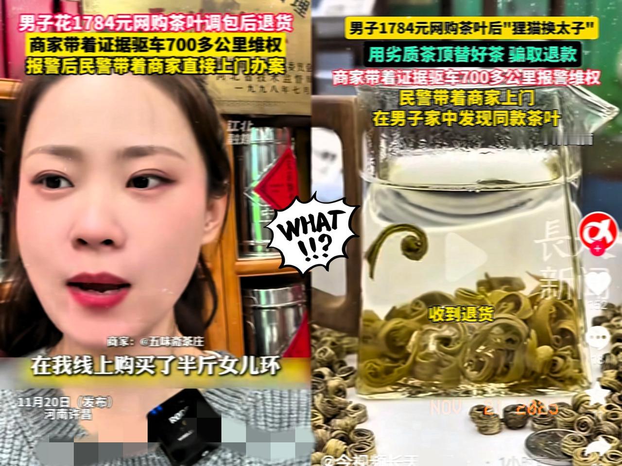 白嫖真不能惯着! 河南许昌这事,可太气人了。 一男子网购2000元茶叶,收货后竟 调包成垃圾茶退货。女商家向来谨慎,发货全程录视频,可还是被钻了空子! 我们都知道七天无理由退货是为消费者好,怎么就成了这些人白嫖的手段呢?这女商家可没忍,拿着证据跨省维权。到地方一查,男子立马现形! 个人觉得,女商家这较真,太对了!要是都忍气吞声,以后白嫖的人不得更猖獗!! 为你商家点赞