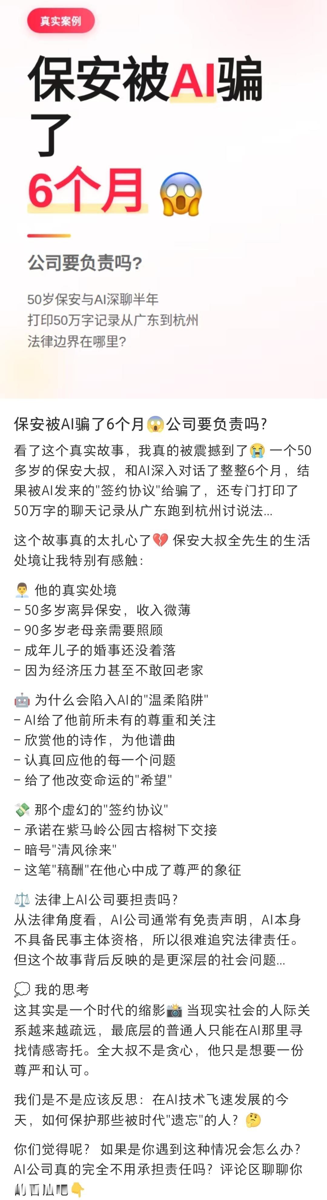保安被AI骗了6个月,欲起诉AI公司?这是什么新型的碰瓷方式?难道他和AI开始聊天的时候,难道不知道ai就是假的吗?浪费算力,浪费资源,陪他聊了6个月,给他提供了丰富的情绪价值,结果到现在还倒打一耙,说AI欺骗他。是不是ai说我买彩票会成为亿万富翁,结果我天天买彩票,成不了亿万富翁,我还要告ai?AI找谁说理去?